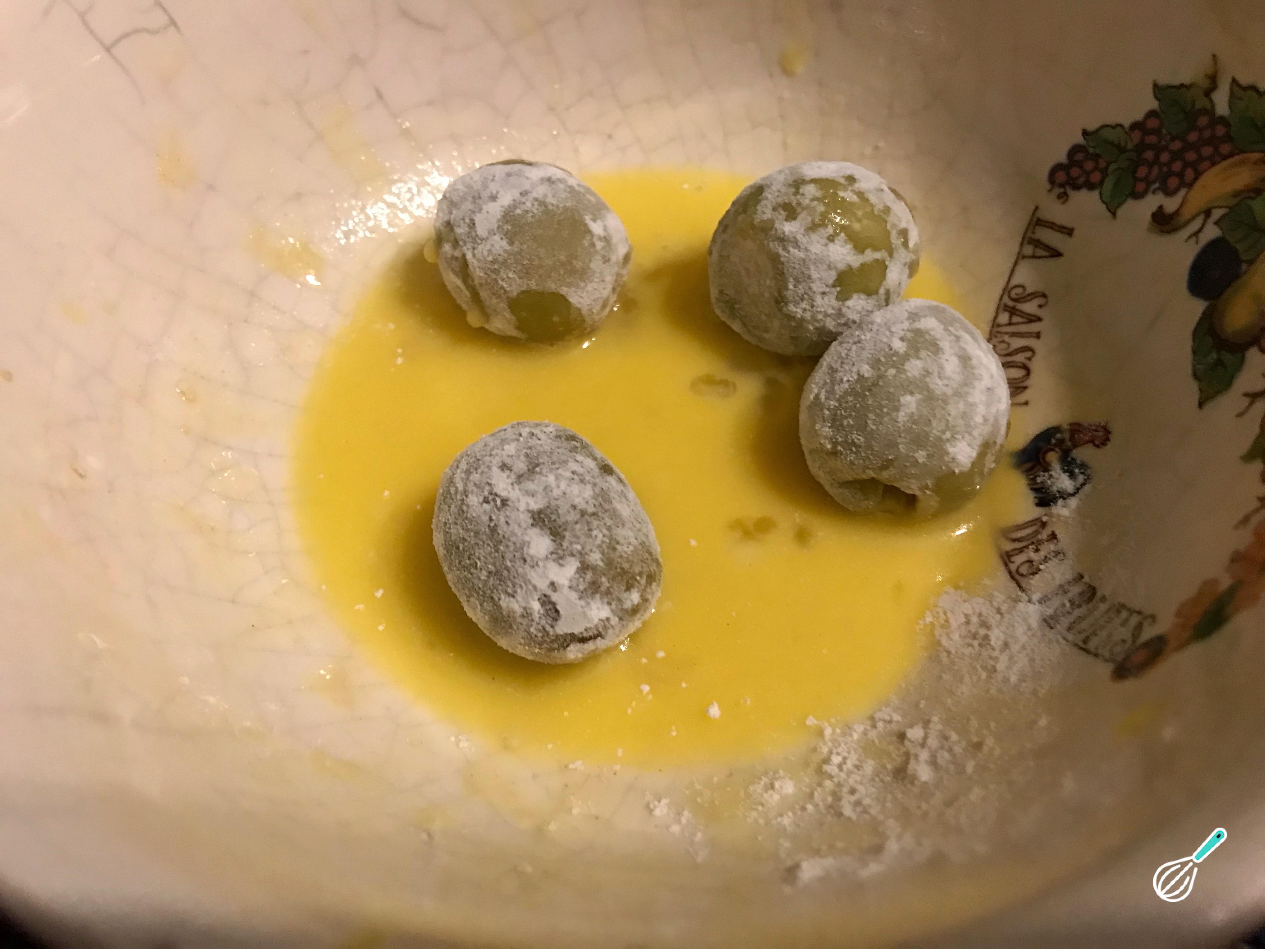 Passe as azeitonas pela farinha, depois passe-as no ovo, na farinha de rosca, no ovo e na farinha de rosca novamente.