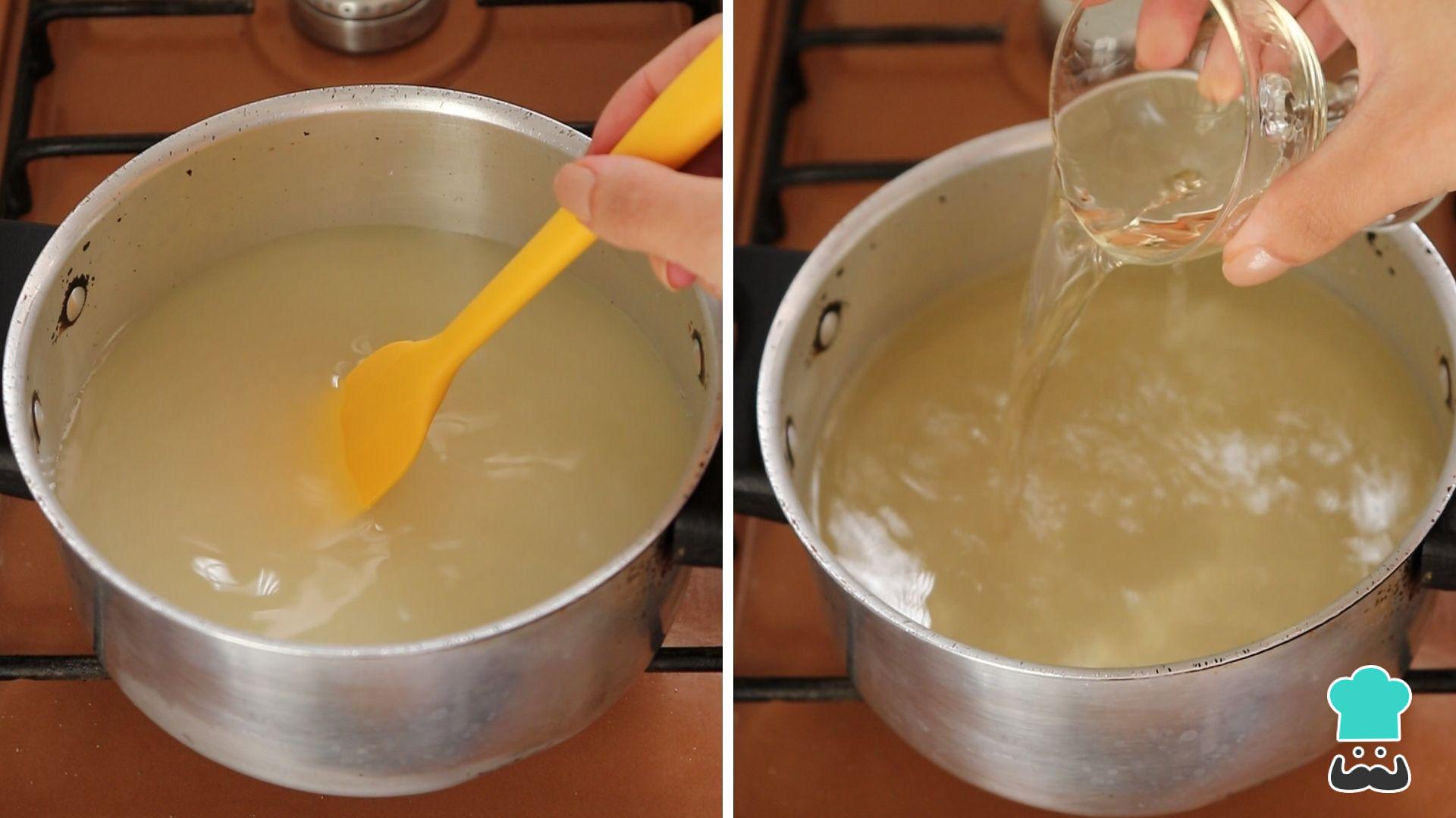 Leve uma panela ao fogo com a água e o açúcar e, assim que o açúcar derreter, desligue o fogo e adicione o rum. Misture.