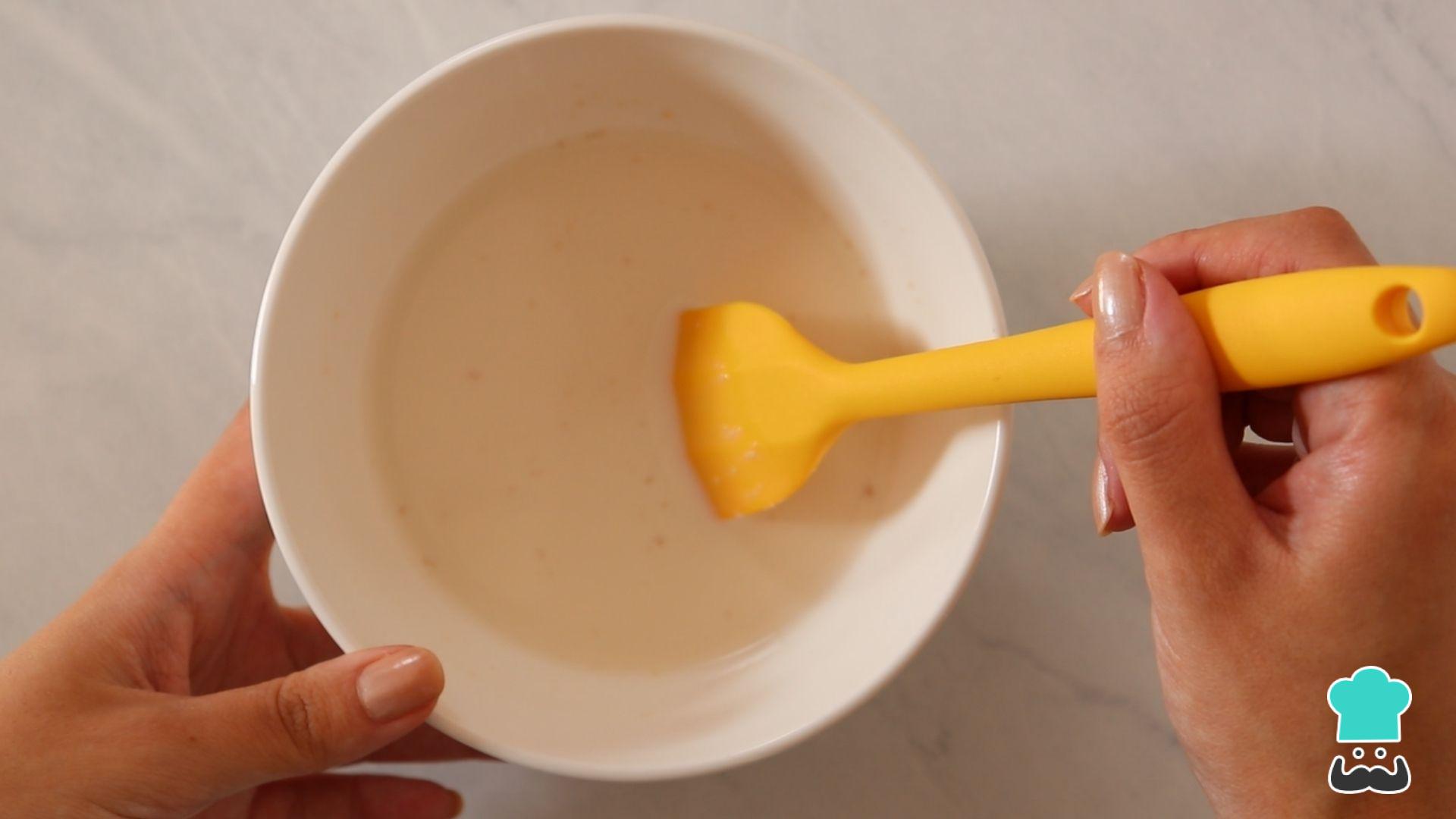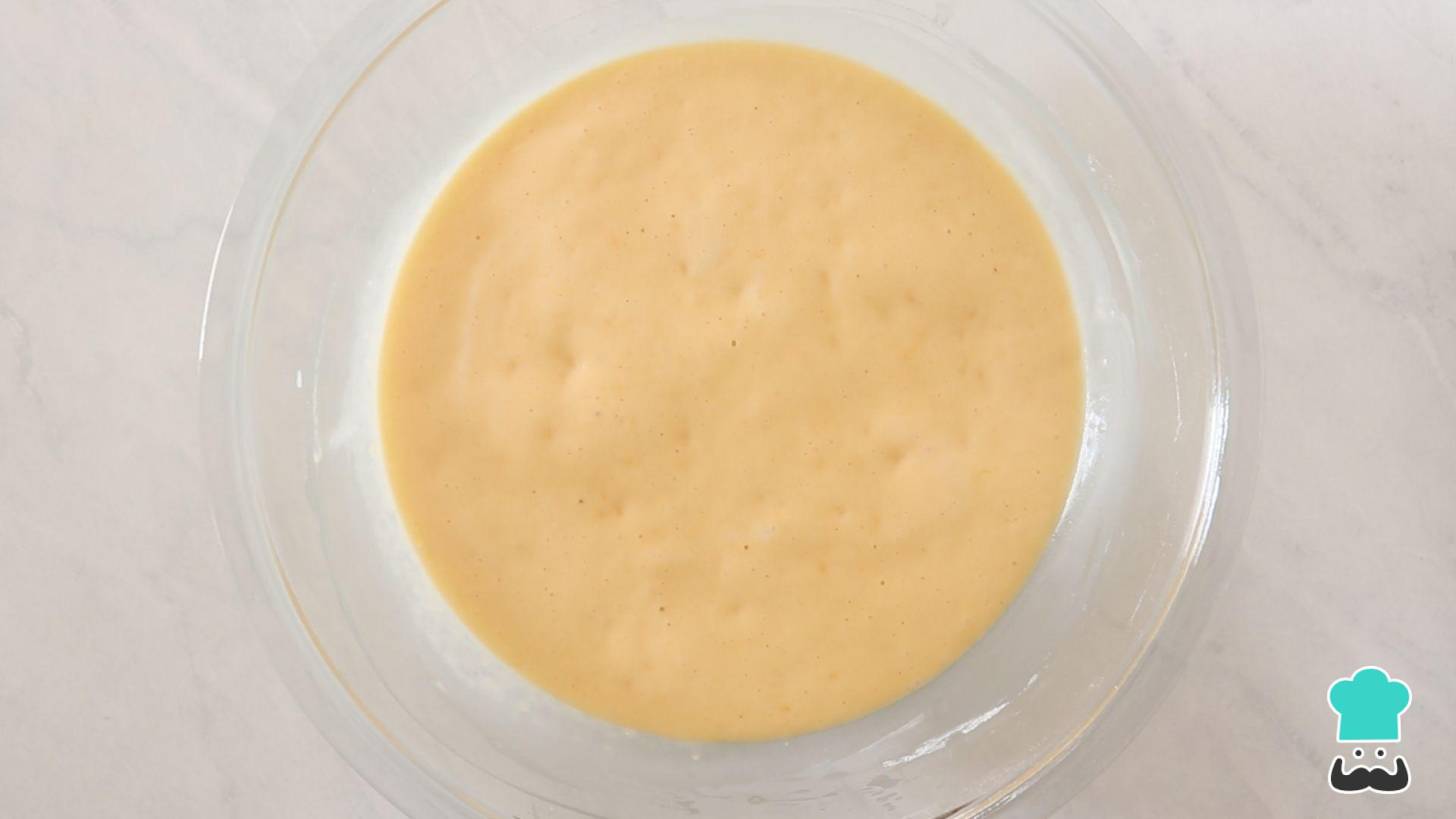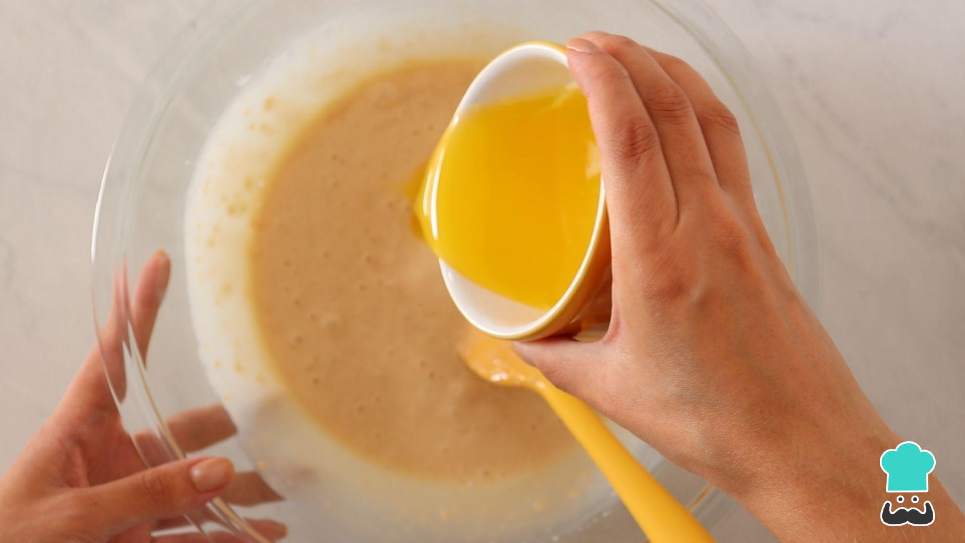 O passo seguinte desta receita francesa de baba ao rum é acrescentar a manteiga derretida e misturar.