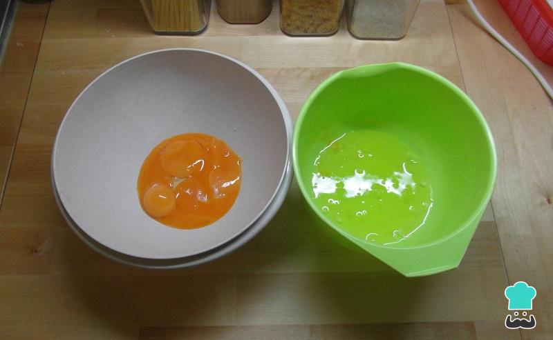 O primeiro passo desta receita de baba de camelo é separar as gemas das claras, colocando-as em tigelas fundas.