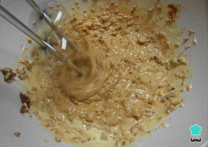Adicione o leite condensado cozido e bata pacientemente até desfazer todos os pedaços e encorpar bem ambos os ingredientes. Reserve.