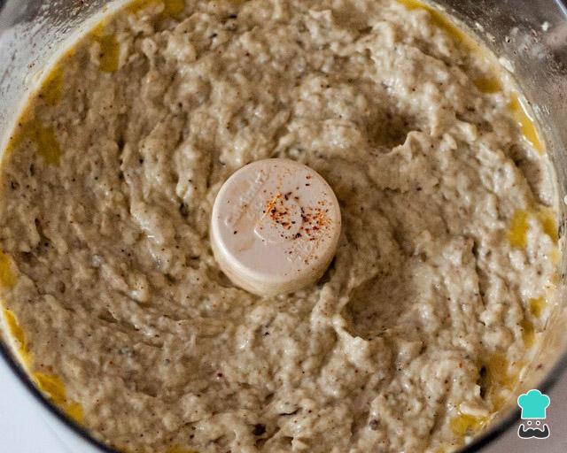 Espere a berinjela esfriar e retire a polpa com a ajuda de uma colher. Coloque a polpa da berinjela num processador ou liquidificador junto com os demais ingredientes (tahine, alho, suco de limão, azeite e sal) e bata até virar uma pasta.