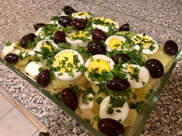 Guarnição: batatas Yukon Gold, azeitonas gregas Kalamata e ovos orgânicos.