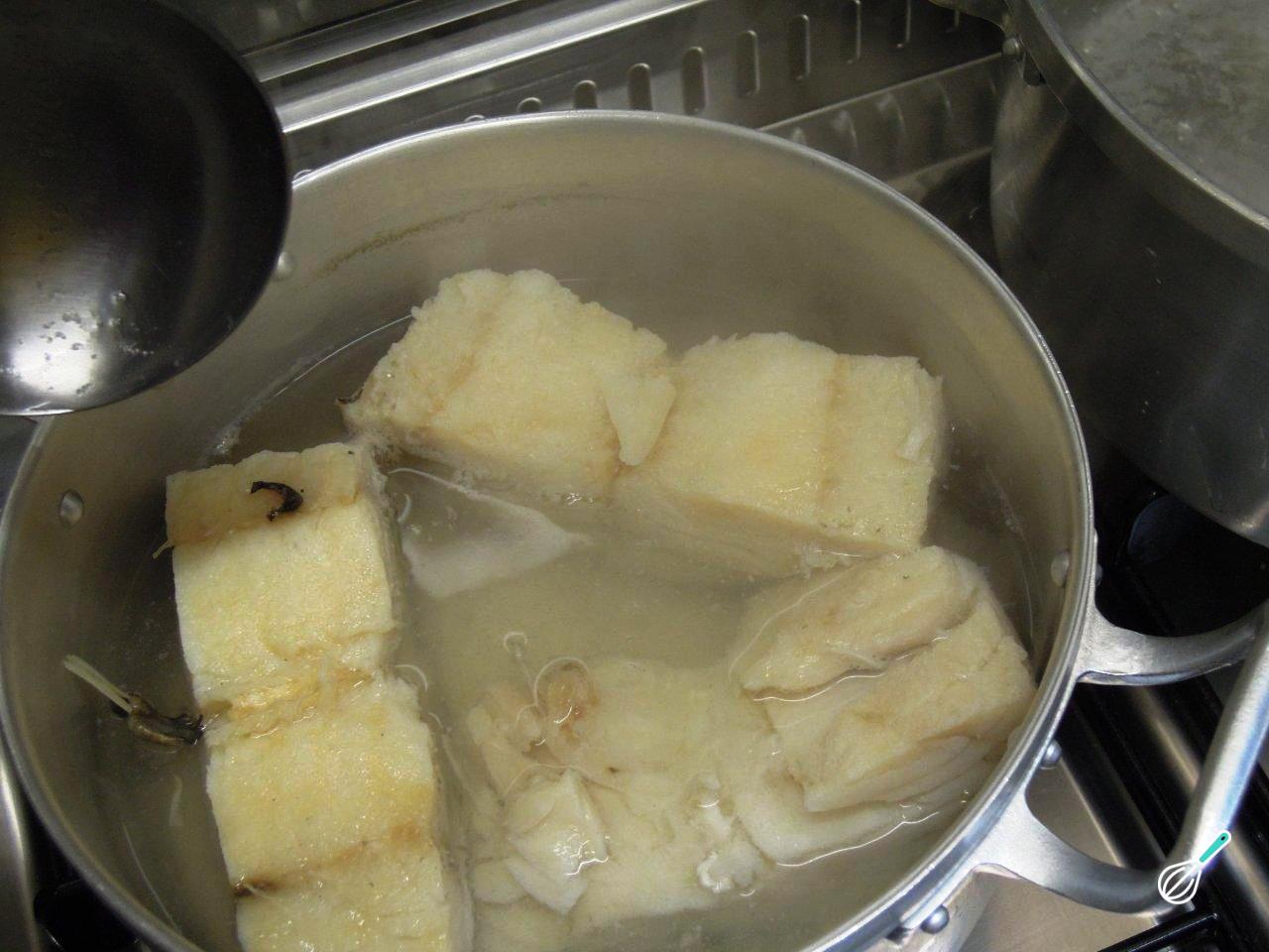 Para fazer bacalhau à Gomes de Sá, comece por ferver o bacalhau em uma panela com água suficiente para cobrir o peixe. De seguida, lave em água corrente para retirar o excesso de sal.