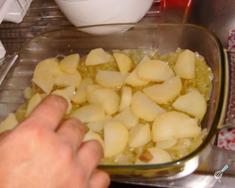 Coloque uma camada de bacalhau em um refratário e cubra com uma camada de batata. Junte novamente uma cama de bacalhau e cubra com as rodelas de cebola refogada. Asse por 15 minutos em forno médio.