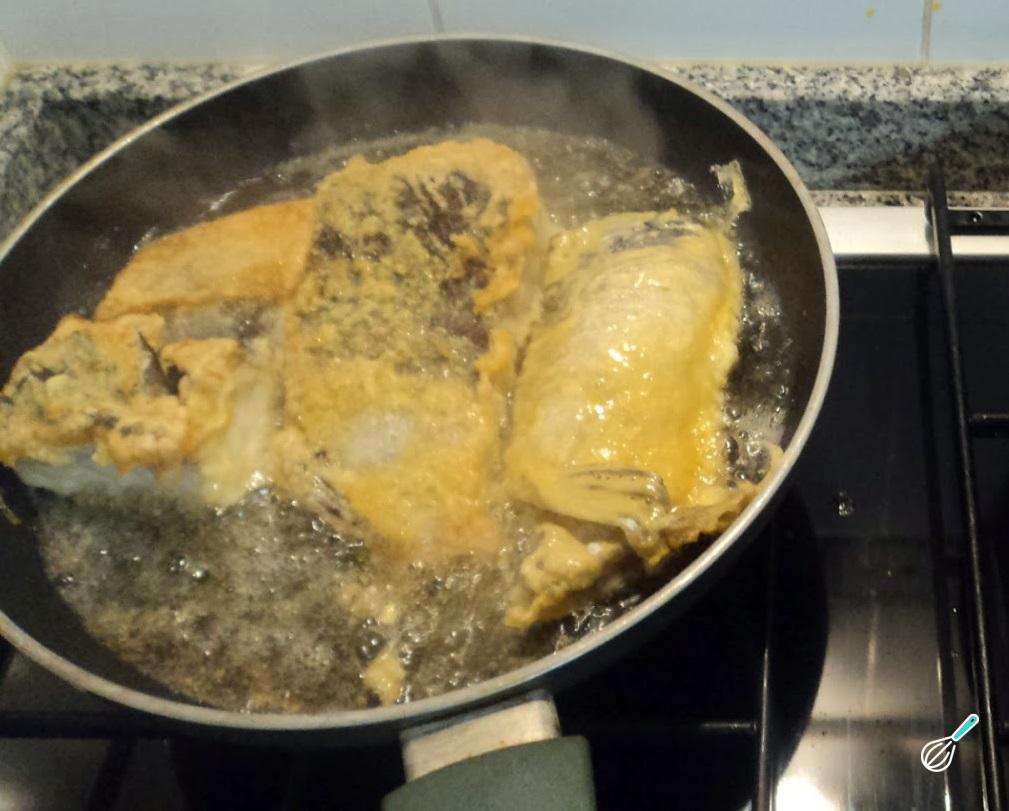 Passe cada posta de bacalhau no ovo batido e na farinha de rosca, apertado bem. Frite no azeite aquecido. Retire e coloque o peixe em um refratário.