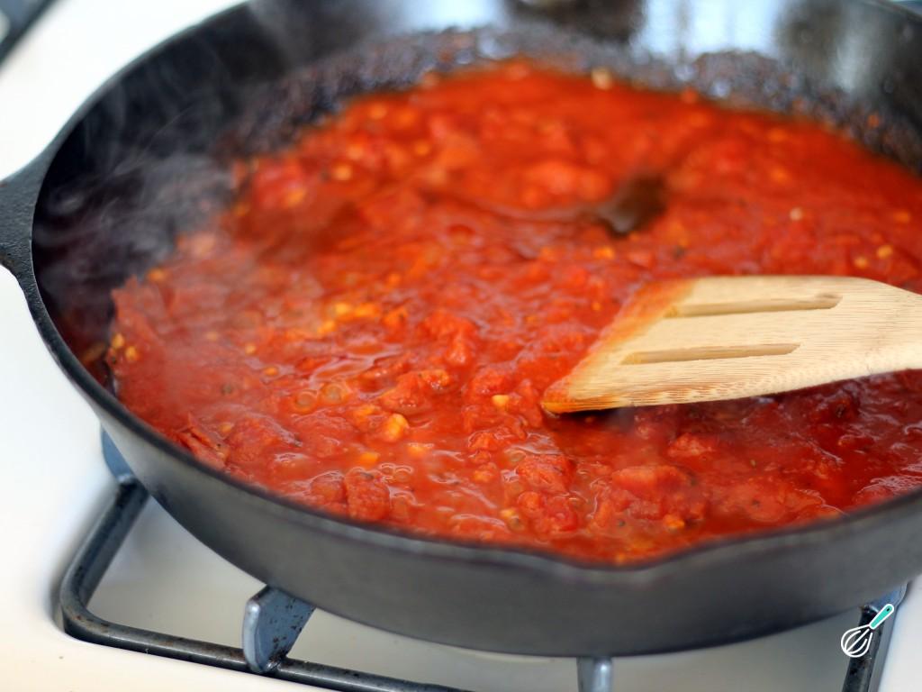 Retire algum azeite da panela, deixando menos de metade. Junte a cebola e o alho e deixe refogar. Junte o tomate e acrescente 200 ml de água. Tempere com sal e pimenta a gosto e deixe ferver em fogo baixo até obter um molho espesso.