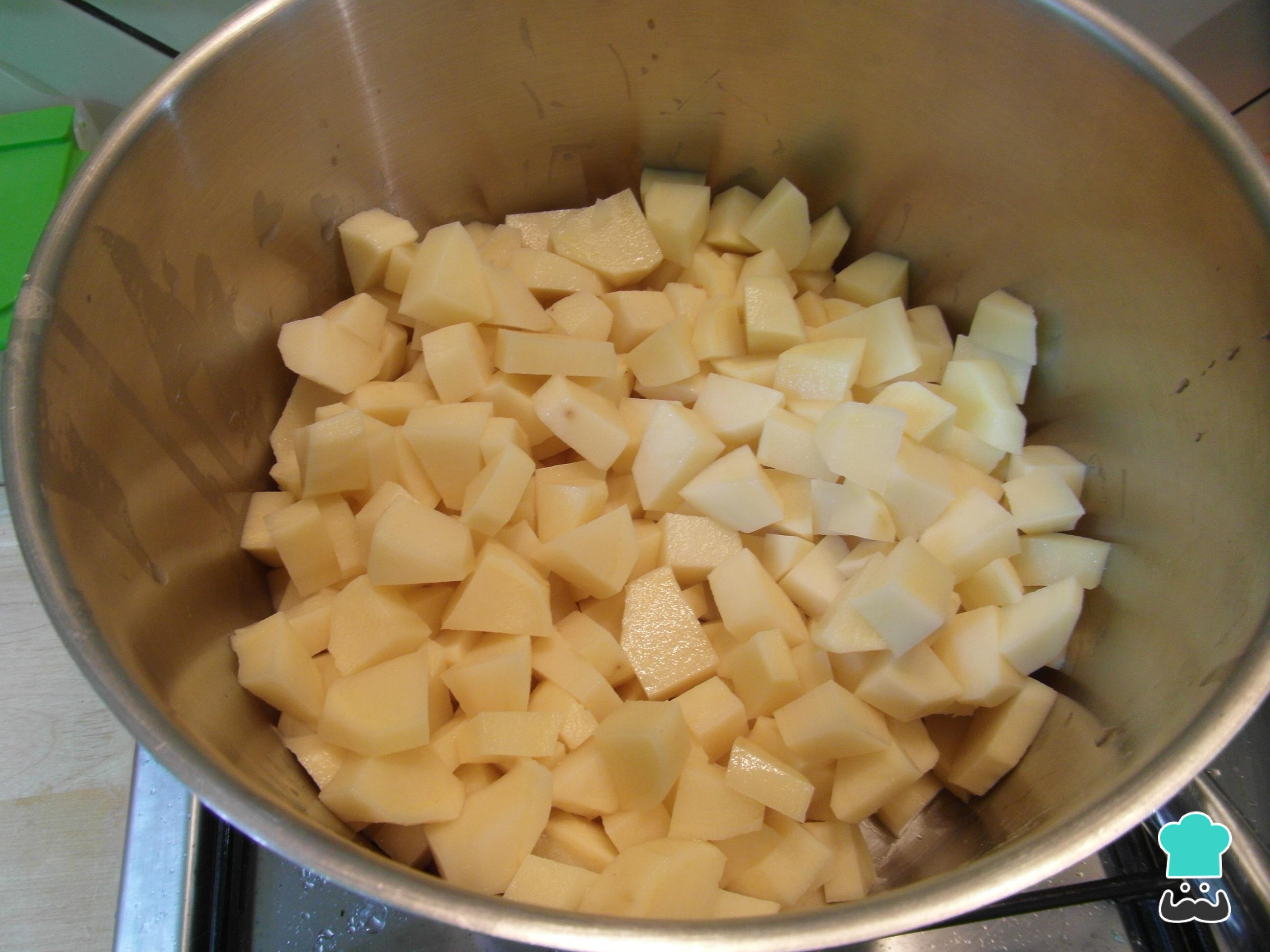 Descasque as batatas e corte em rodelas ou em cubos. Seguidamente cozinhe as batatas do jeito que preferir: numa panela com água e um pouco de sal até ficarem macias ou fritando em óleo quente.