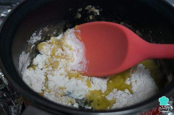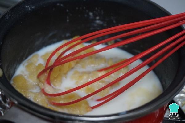 Agora prepare o molho branco para conseguir um bacalhau no forno cremoso: coloque a manteiga numa panela e leve ao fogo para derreter. Quando a manteiga derreter adicione a farinha e fique mexendo por 2-3 minutos, para misturar e eliminar o gosto de farinha crua.