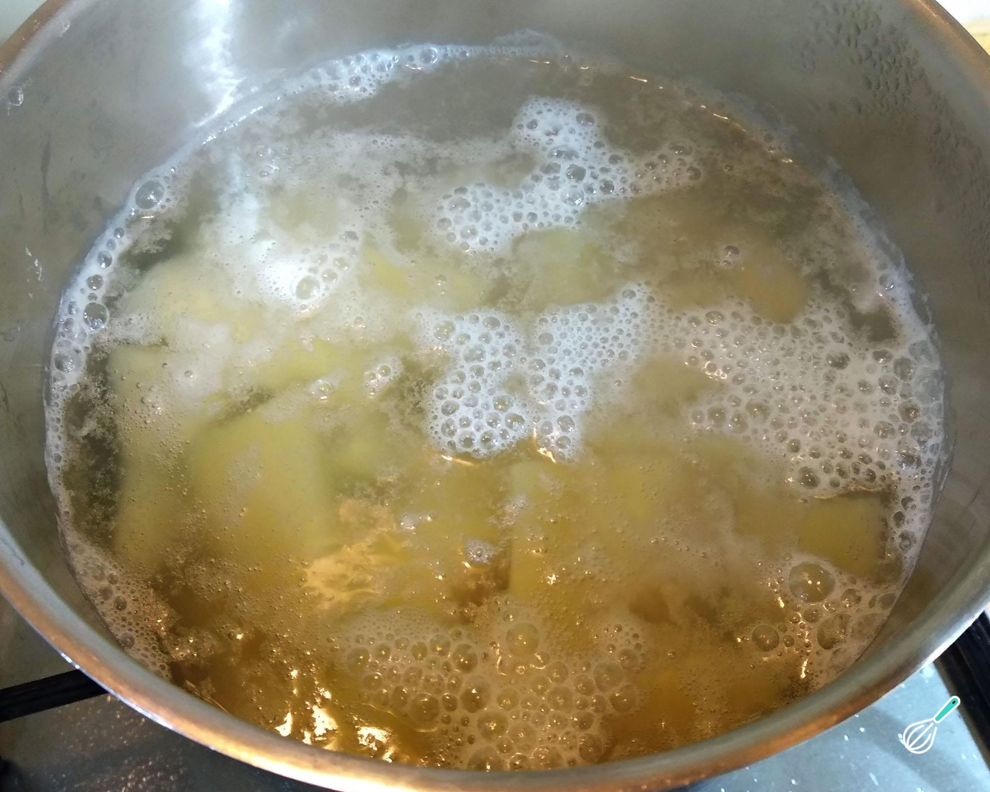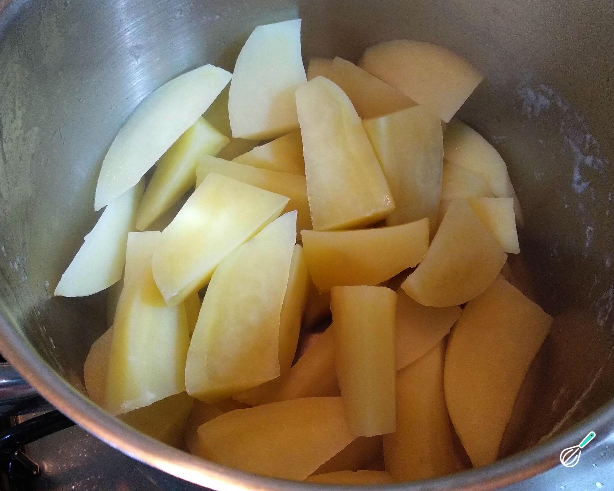 Enquanto isso descasque as batatas e corte em gomos. Coloque numa panela com água e sal e leve ao fogo médio por 5 minutos (contando depois que a água começa a ferver).