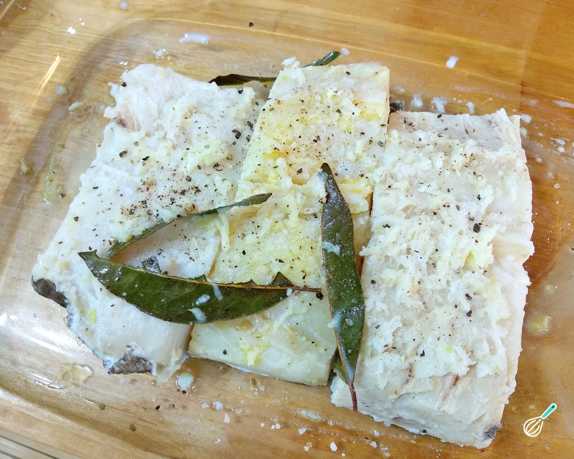 Depois de deixar o bacalhau de molho no leite, coe o leite com uma peneira e reserve-o também (ele será usado no preparo do molho branco). Unte uma assadeira com um fio de azeite e coloque nela o bacalhau. Acrescente o alho que ficou na peneira após coar o leite e também as folhas de louro. Tempere com sal e pimenta do reino a gosto.