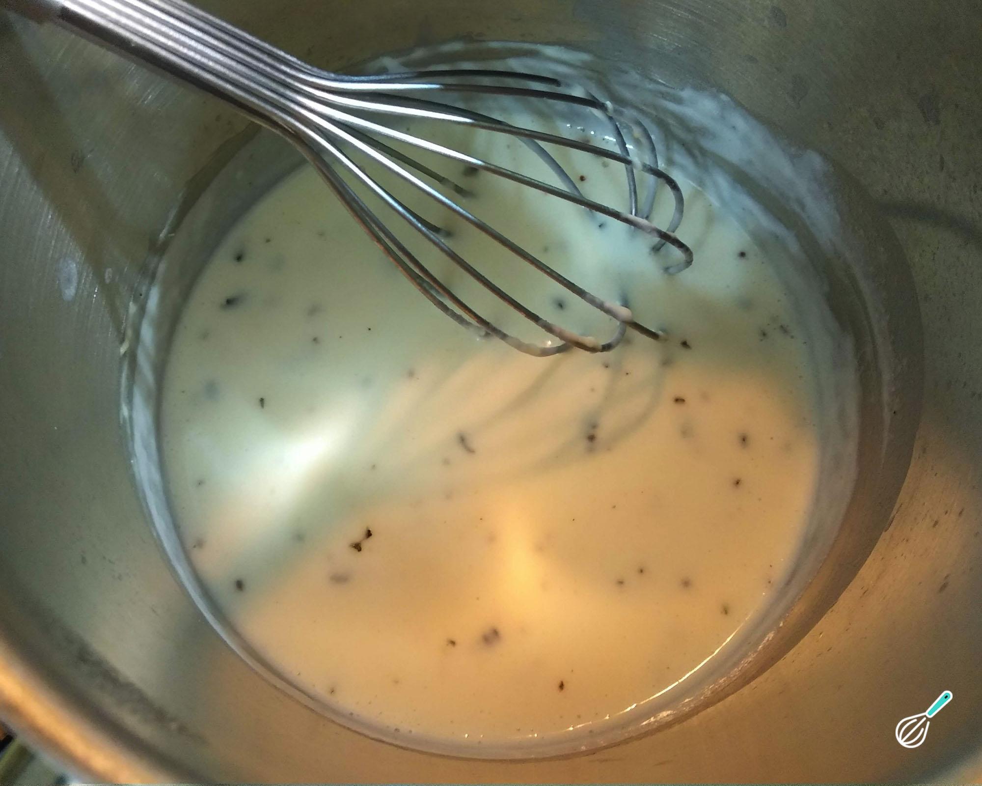 Enquanto isso, leve ao fogo médio uma panela com a manteiga e a farinha e mexa até a manteiga derreter e misturar com a farinha. Depois adicione o leite reservado aos poucos, enquanto mexe. Fique mexendo até virar um molho branco cremoso e tempere a gosto com sal e pimenta do reino. Desligue o fogo e reserve.