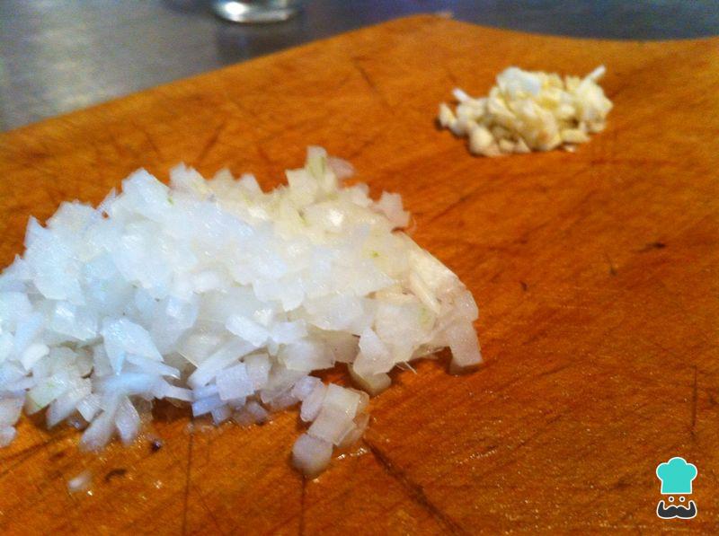 Em seguida pique finamente a cebola e o alho, para preparar o refogado.