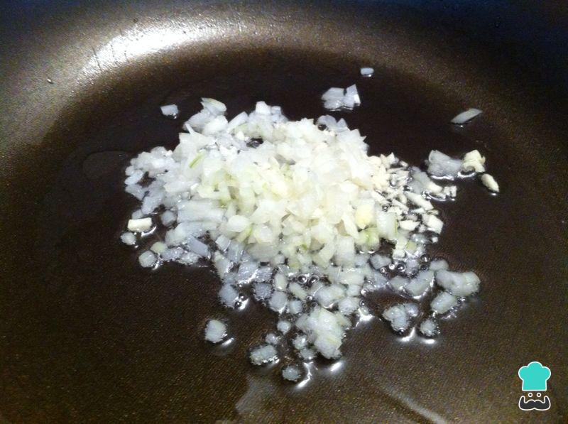 Leve ao fogo baixo uma frigideira com o azeite. Quando estiver ligeiramente quente, acrescente a cebola e o alho e deixe refogar lentamente.