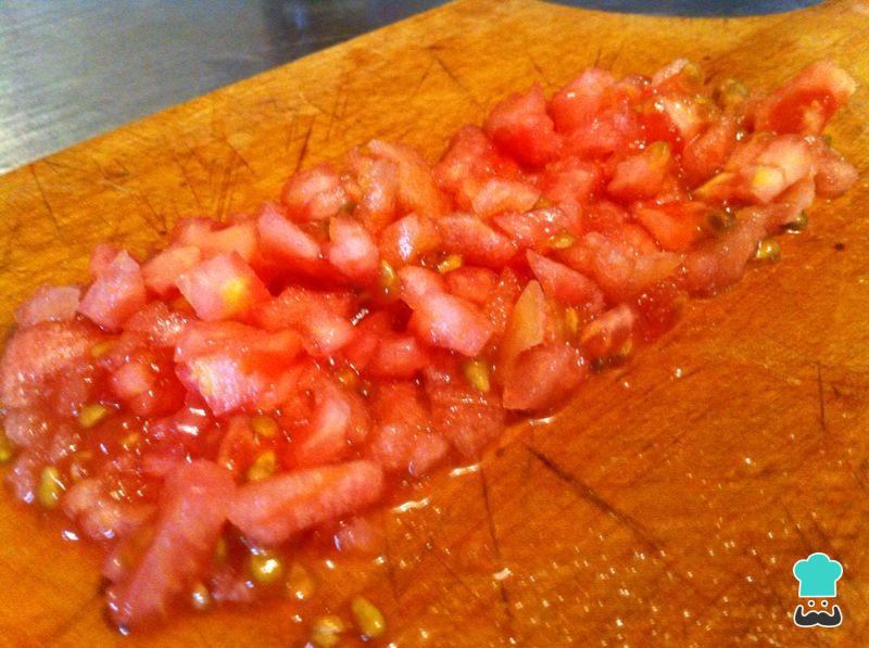 Enquanto isso, lave, pele e corte o tomate em cubos pequenos.