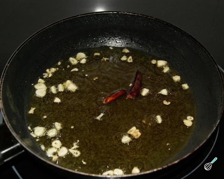 Pique os alhos e coloque numa frigideira com a malagueta e o azeite. Leve ao fogo baixo e deixe fritar, para aromatizar o azeite em que vamos cozinhar este bacalhau com páprica.