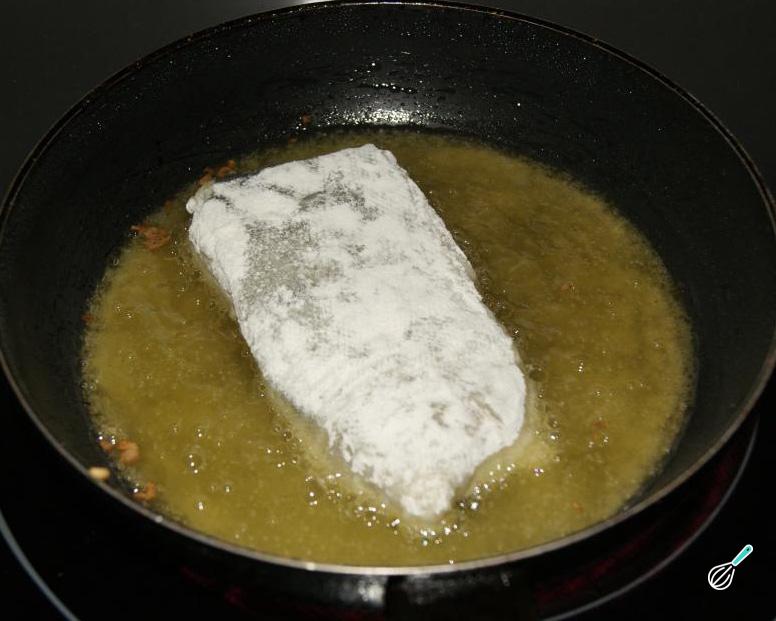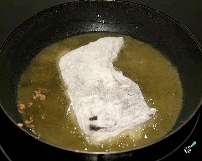 Empane as postas de bacalhau em farinha, pressionando bem para grudar. Quando os alhos estiverem dourados significa que o azeite está quente o suficiente para fritar o bacalhau, por isso coloque uma ou duas postas na frigideira com a pele virada para cima.