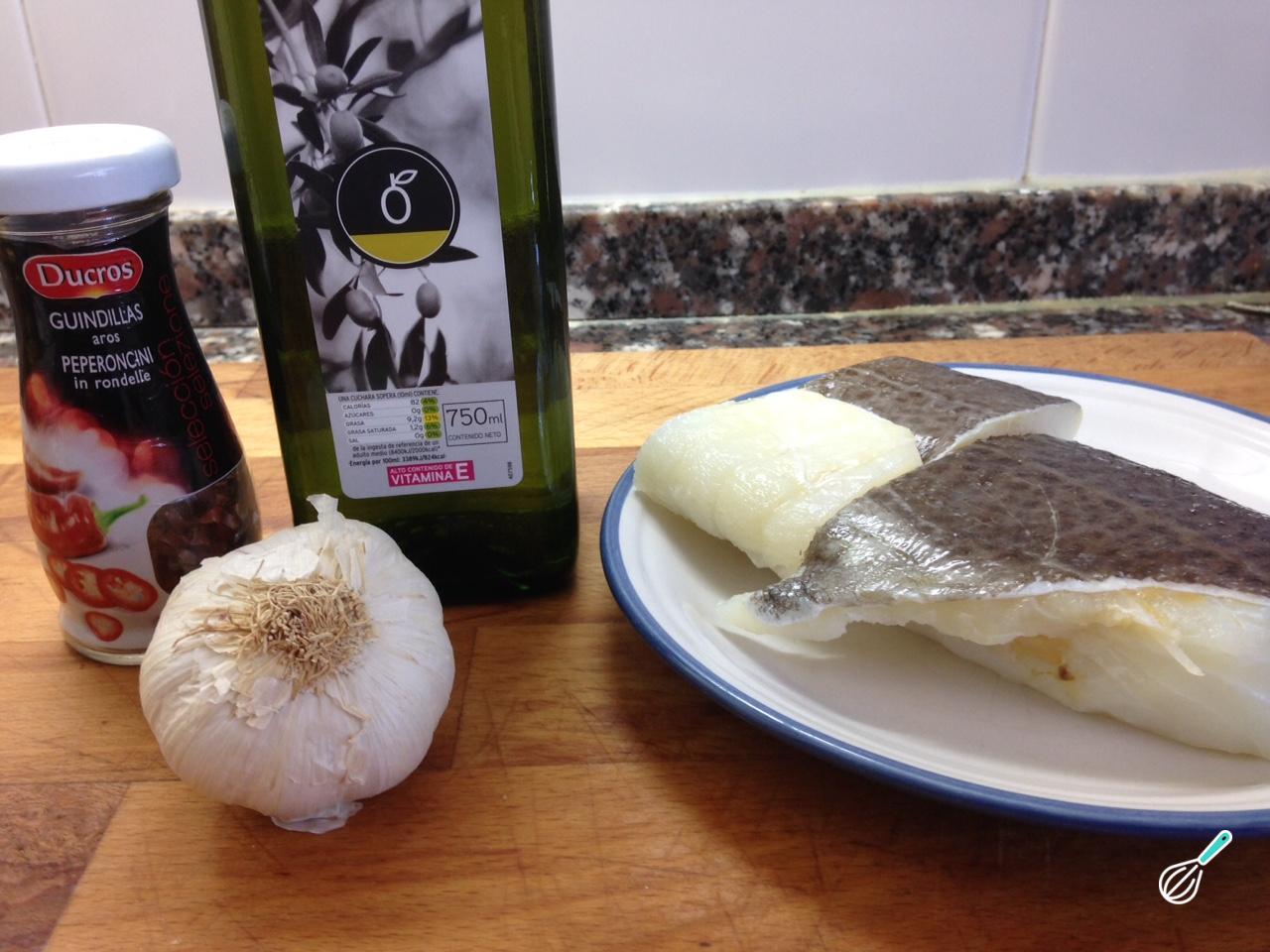 Comece por reunir os ingredientes necessários a este confit de bacalhau. Para que o resultado seja saboroso e saudável, é importante usar um azeite de boa qualidade e um termômetro de cozinha.