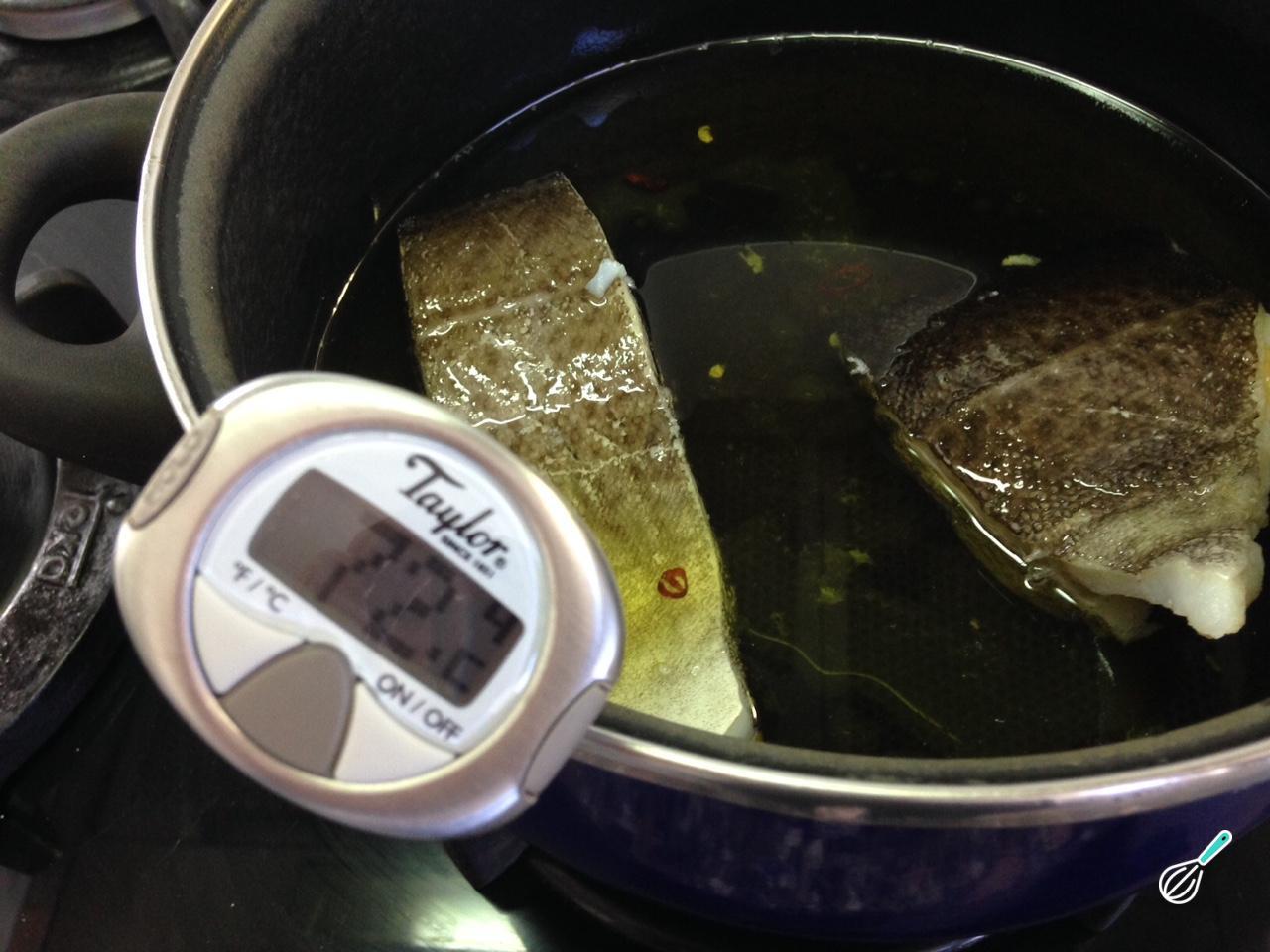 Depois acrescente a pimenta, baixe o fogo e use o termômetro de cozinha para controlar a temperatura do azeite. Espere que o azeite fique nos 80ºC para adicionar o bacalhau e cozinhar por 10-15 minutos, ou um pouco mais se os lombos forem altos.