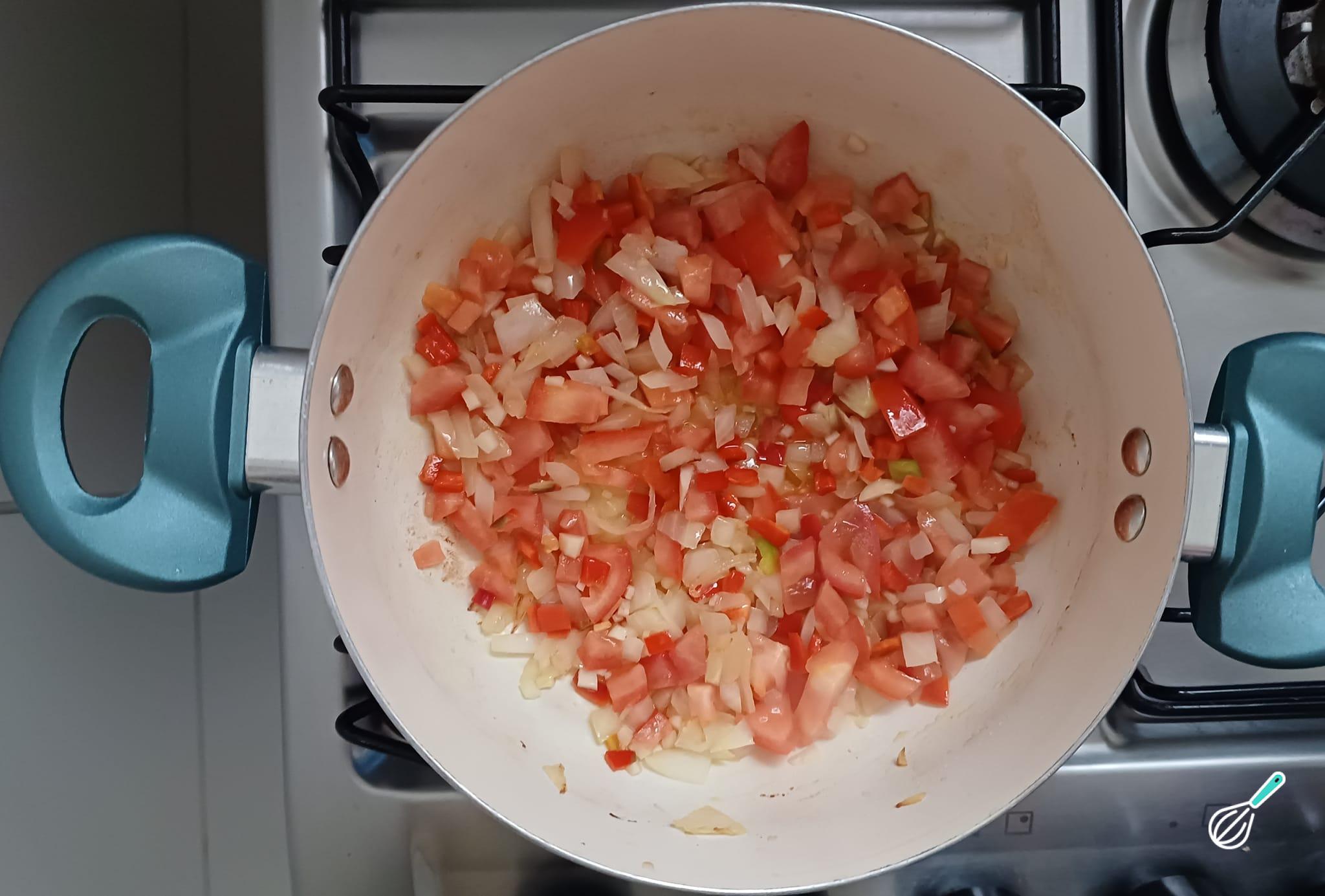 Numa panela média refogue o alho, a cebola, o tomate e o pimentão com azeite de oliva, por alguns minutos.