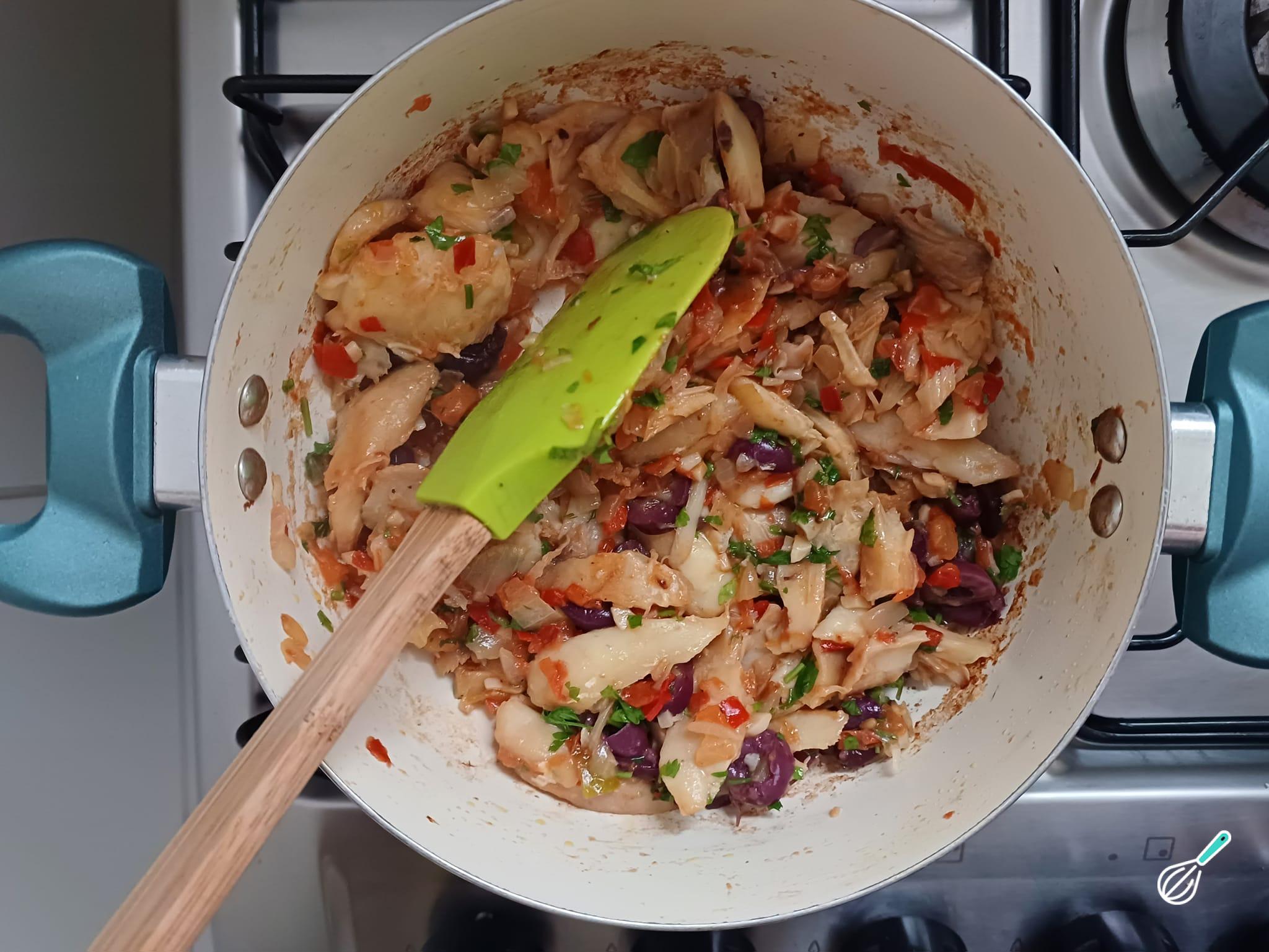 Adicione o bacalhau dessalgado e em lascas e refogue por mais 10 minutos em fogo baixo, mexendo de vez em quando.