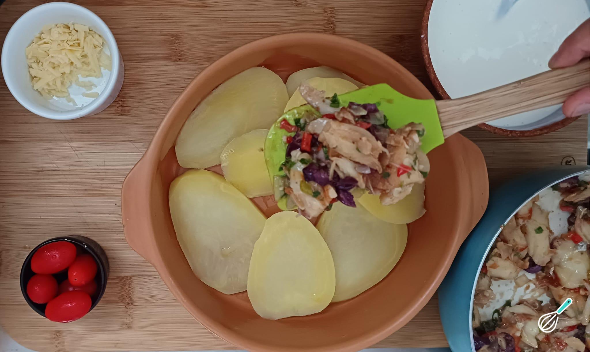 Coloque por cima das batatas, o refogado de bacalhau, espalhando bem.