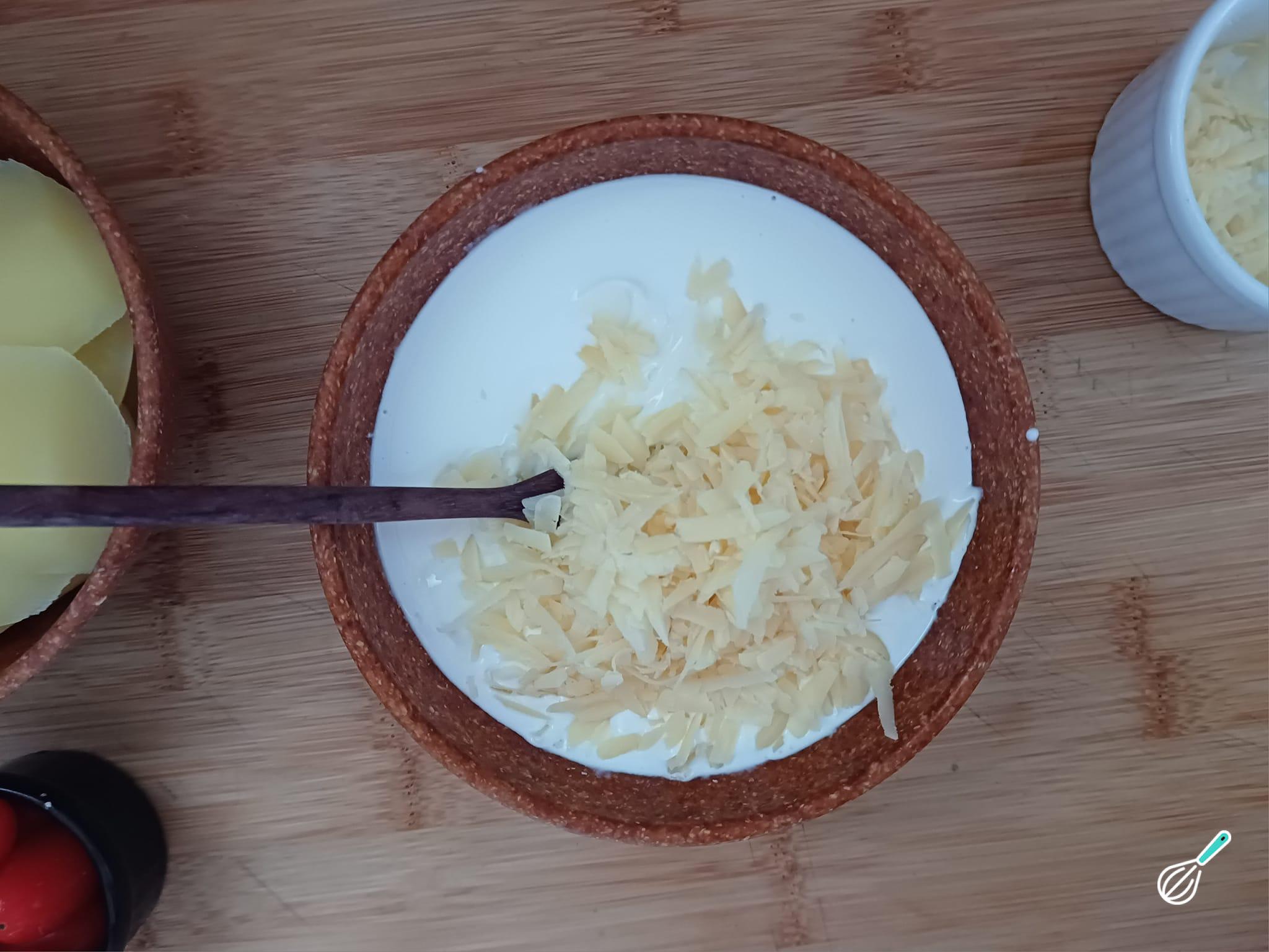 Para a cobertura misture o requeijão cremoso com o creme de leite e o queijo parmesão ralado (deixando um pouco para decorar o prato antes de assar)