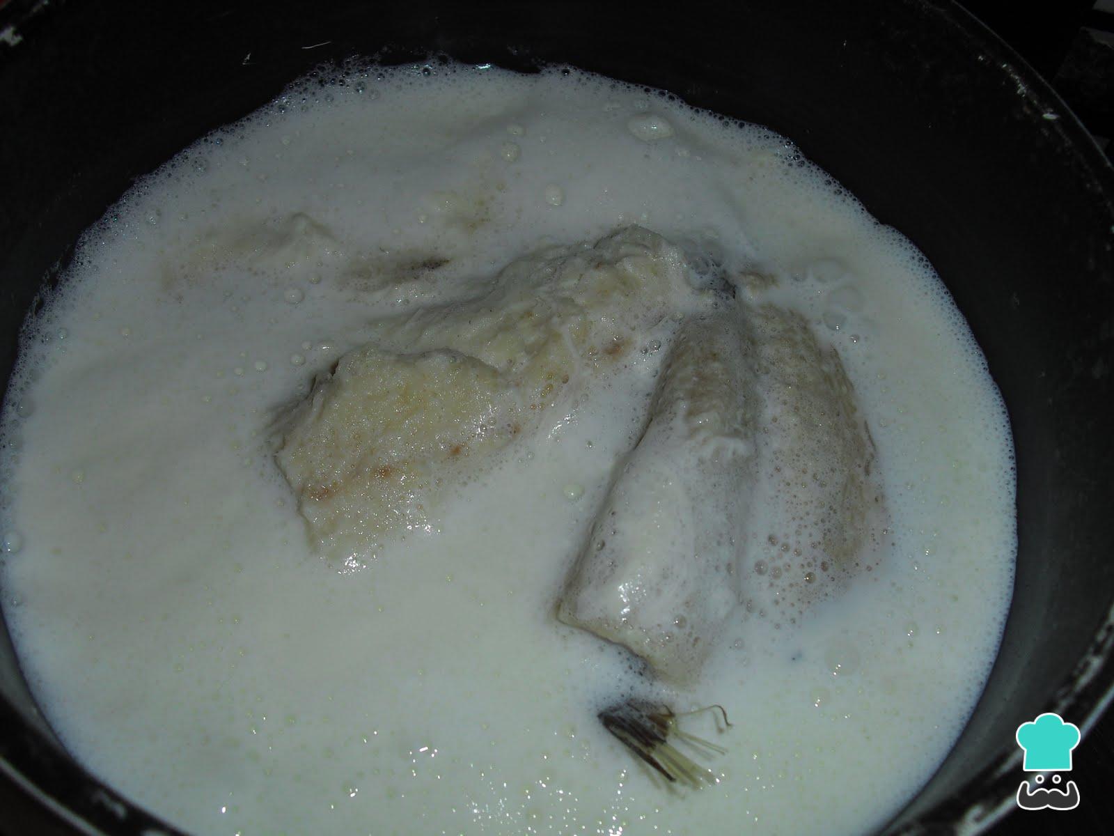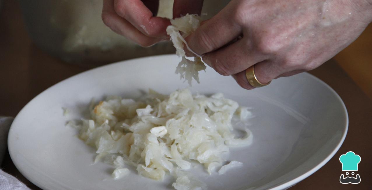 Após esse tempo, o passo seguinte do bacalhau desfiado é retirar o bacalhau da panela e esperar que esfrie ligeiramente. Retire a pele, as espinhas e desfie.