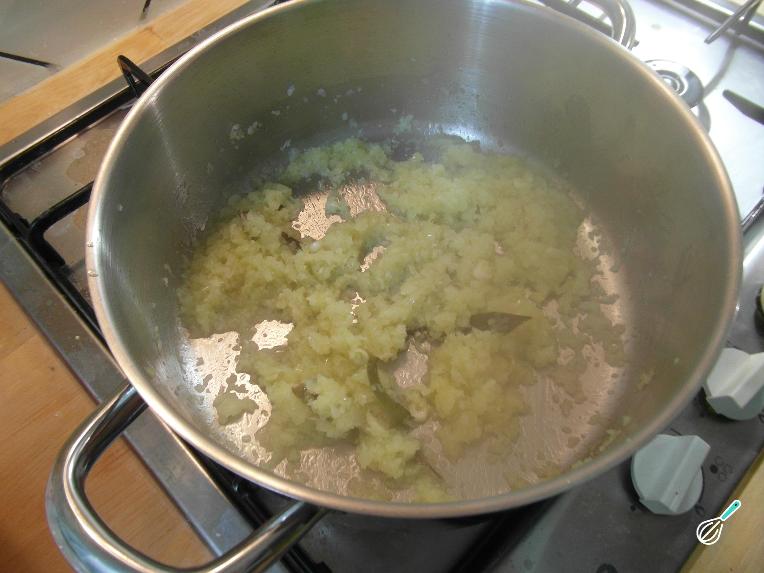 Com o bacalhau já dessalgado, prepare um refogado no fogo médio com o azeite, as cebolas e os alhos picadinhos e as folhas de louro. Quando as cebolas estiverem transparentes, adicione o bacalhau, misture e cozinhe por 5-10 minutos (o bacalhau irá terminar de cozinhar no forno).
