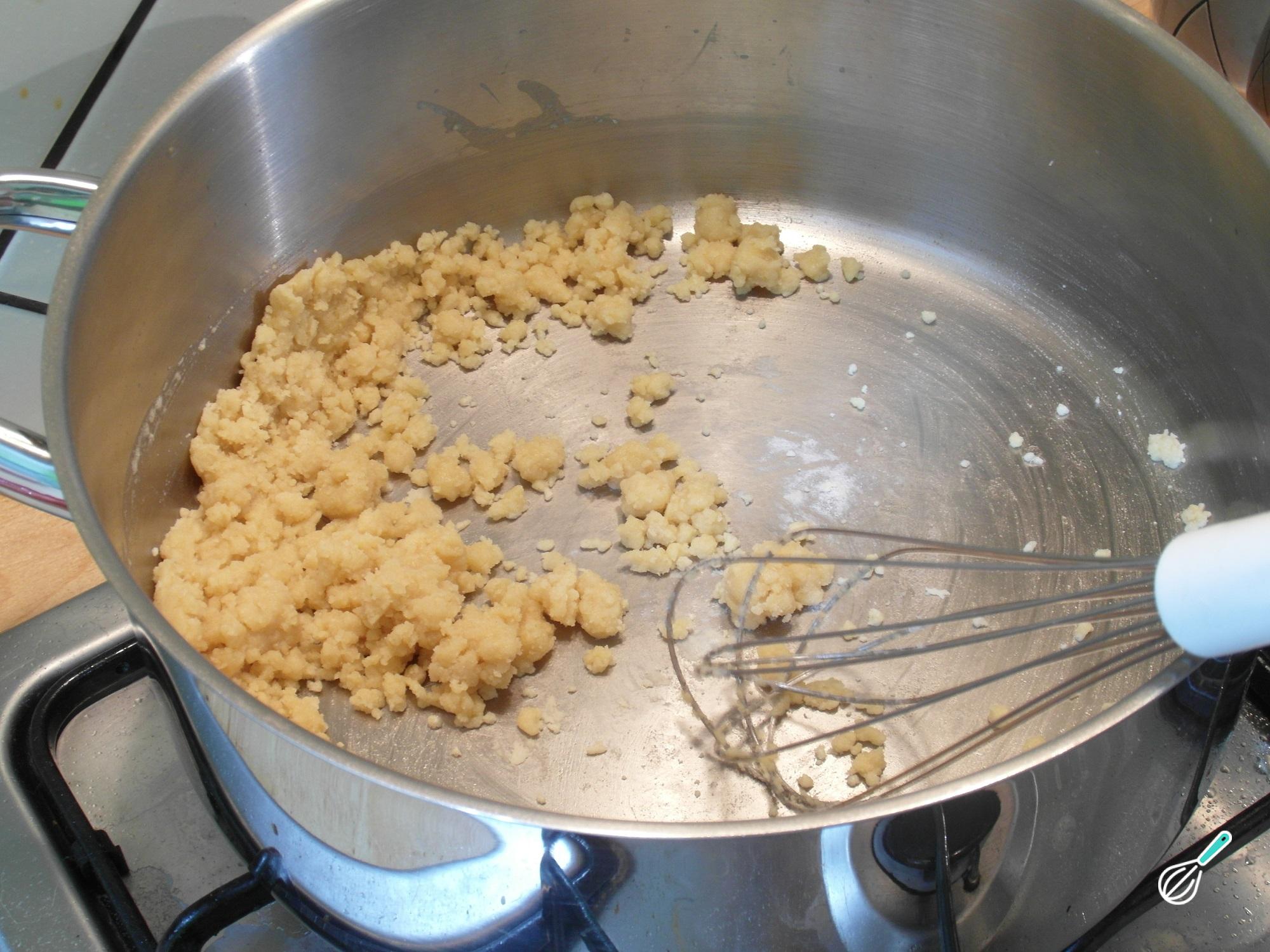 Enquanto isso, e para conseguir um bacalhau no forno cremoso, prepare o molho branco: leve ao fogo médio uma panela com a manteiga e a farinha e mexa até obter uma pasta esfarelada, como na imagem.