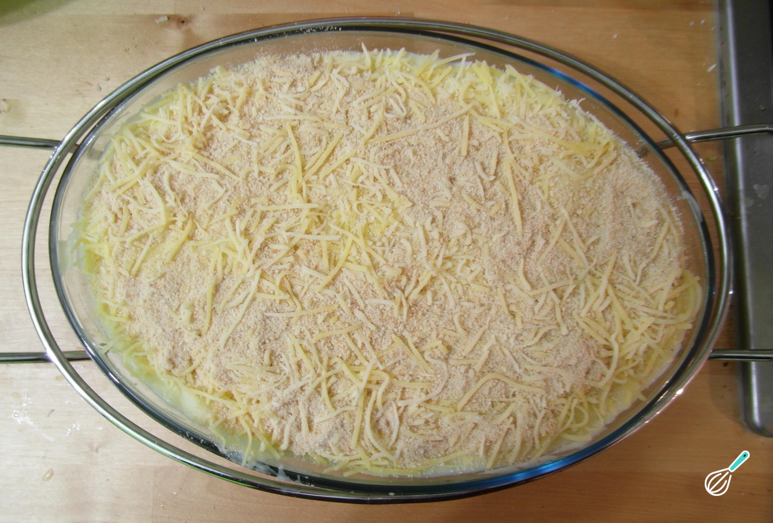 Quando o bacalhau, o molho branco e as batatas estiverem prontas, misture tudo em uma vasilha grande junto com o creme de leite. Tempere a gosto com sal e pimenta e transfira para uma assadeira untada. Cubra com farinha de rosca e queijo ralado, para conseguir uma crosta crocante.