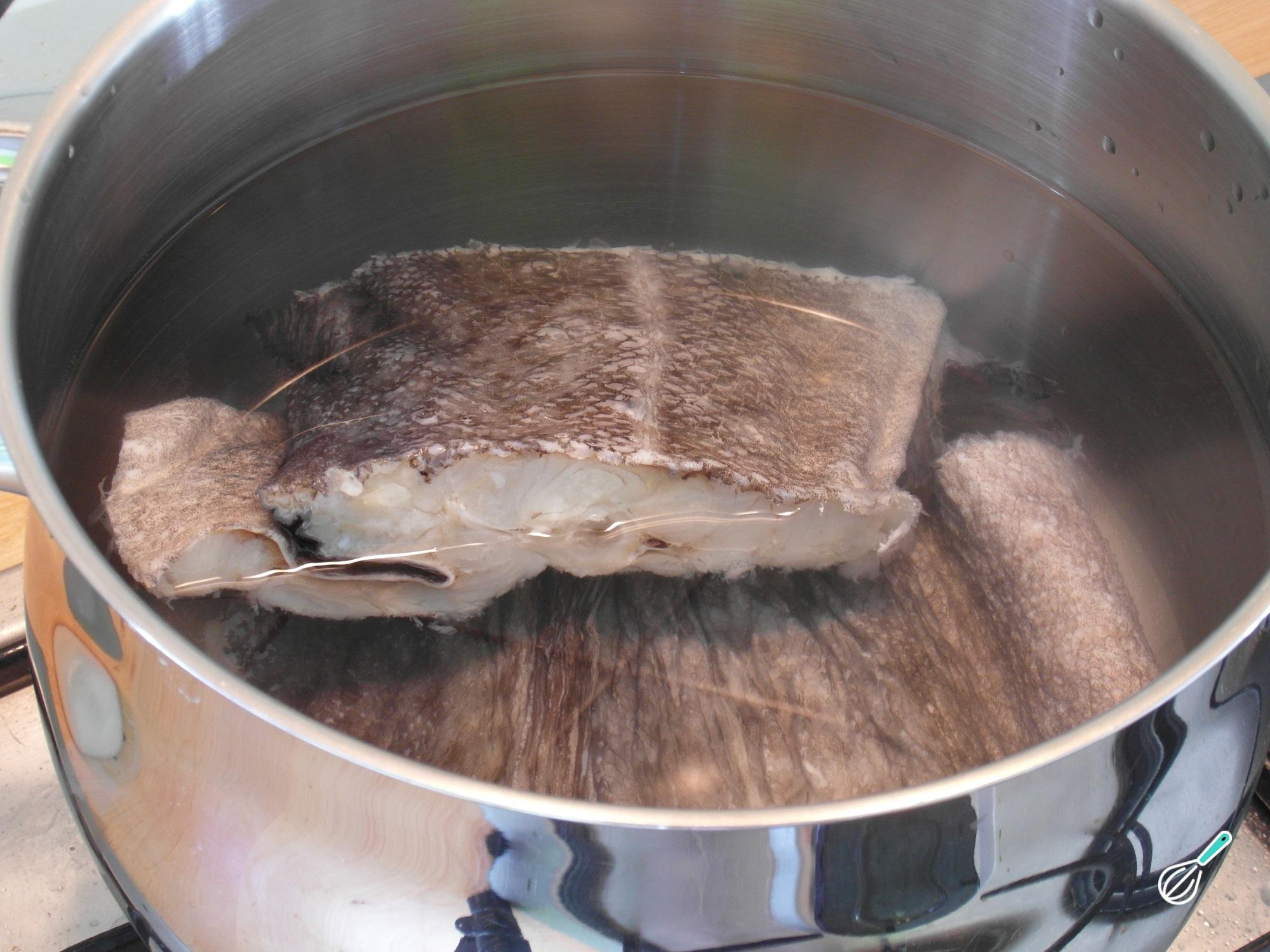Enquanto isso, cozinhe as postas de bacalhau por 10 minutos, em uma panela com água abundante. No final, reserve 275 ml da água, retire as peles e espinhas do bacalhau, e desfie.