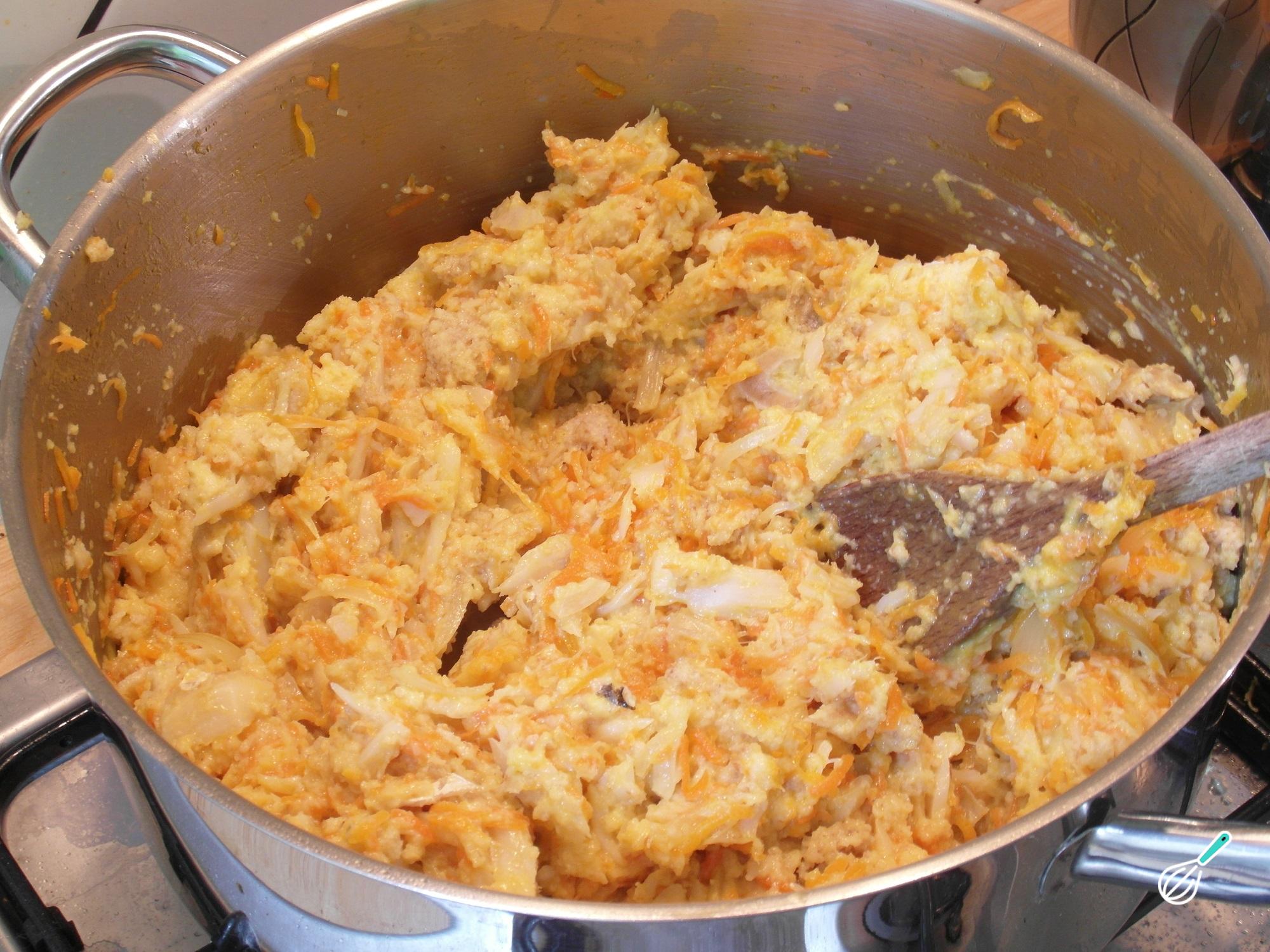 Após o passo anterior, acrescente o bacalhau e refogue por 5 minutos, mexendo de vez em quando, para não queimar. Finalmente adicione o pão, misture muito bem até obter uma pasta, e complete com metade do molho branco. Corrija o sabor com sal, pimenta e noz moscada, e desligue o fogo.
