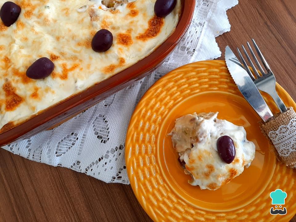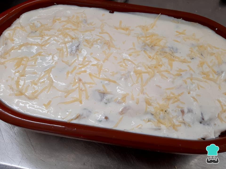 Por último, preencha com o creme para gratinar e polvilhe queijo parmesão ralado. Leve para assar em forno pré aquecido a 180 - 200 graus por cerca de 30 minutos ou até gratinar.