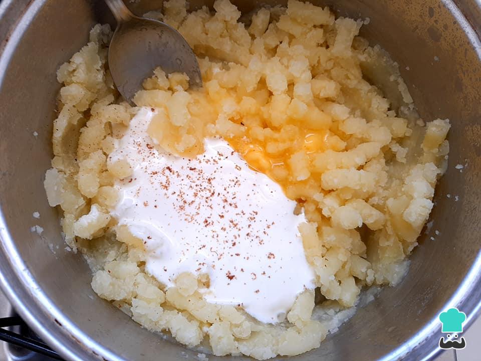 Primeiro prepare o purê de batatas. Descasque as batatas e cozinhe-as em água e sal até ficarem bem macias, em seguida escorra a água do cozimento. Amasse as batatas na própria panela e adicione o creme de leite, a manteiga e a noz moscada.