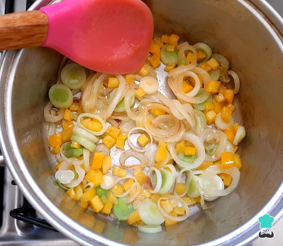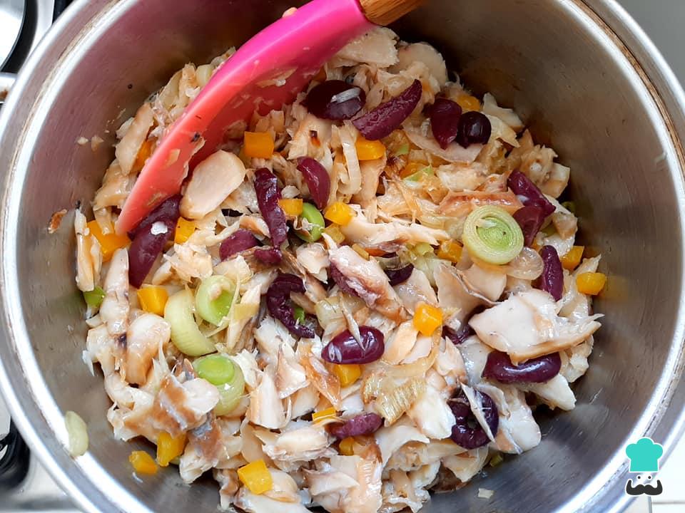 Prepare o refogado de bacalhau, começando por aquecer o azeite de oliva. Refogue primeiro a cebola em rodelas, em seguida o alho poró em rodelas e por último o pimentão amarelo ou vermelho picado. Deixe refogando por alguns minutos, em fogo baixo mexendo sempre para não queimar.