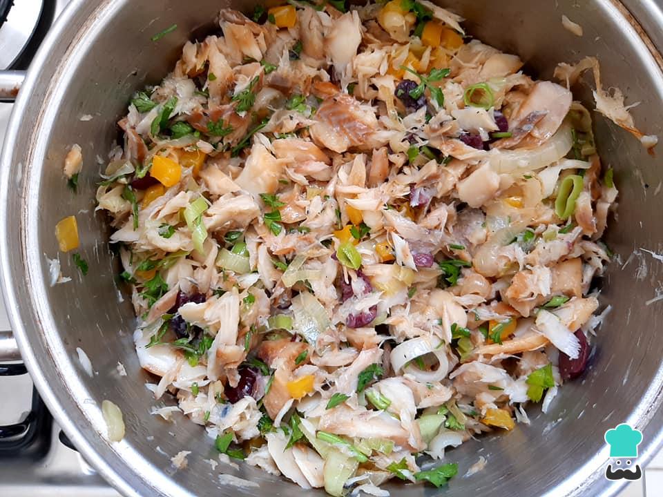 Desligue o fogo, adicione a salsa picada e misture tudo. Reserve esse refogado de bacalhau, que será o recheio da nossa receita de bacalhau gratinado!