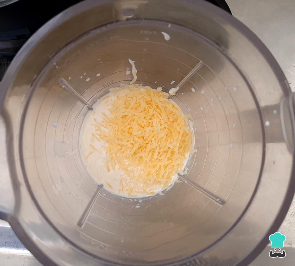 Prepare o creme para o gratinado batendo no liquidificador o creme de leite, o requeijão cremoso, o leite líquido, o sal e o queijo parmesão ralado, por cerca de 1 minuto, até ficar bem homogêneo e cremoso.
