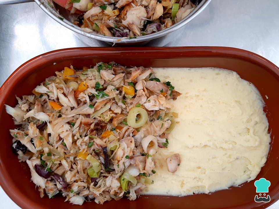 Num refratário médio, untado com azeite de oliva ou manteiga, faça uma camada com o purê de batata, espalhando bem. Em seguida cubra com o refogado de bacalhau, como mostra a foto.