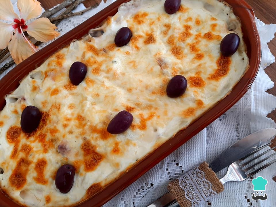 Assim que retirar do forno, decore o bacalhau gratinado com azeitonas pretas, se quiser!