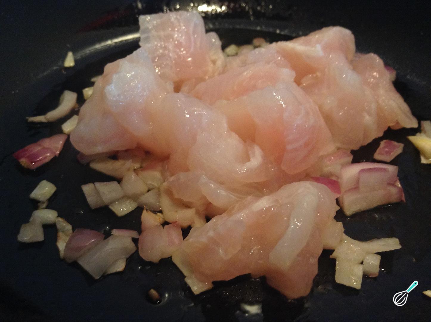 Adicione o bacalhau em pedaços, como é observado na foto. O objetivo é selar a proteína para depois marinar. Desligue o fogo para evitar o peixe cozinhe demasiado.