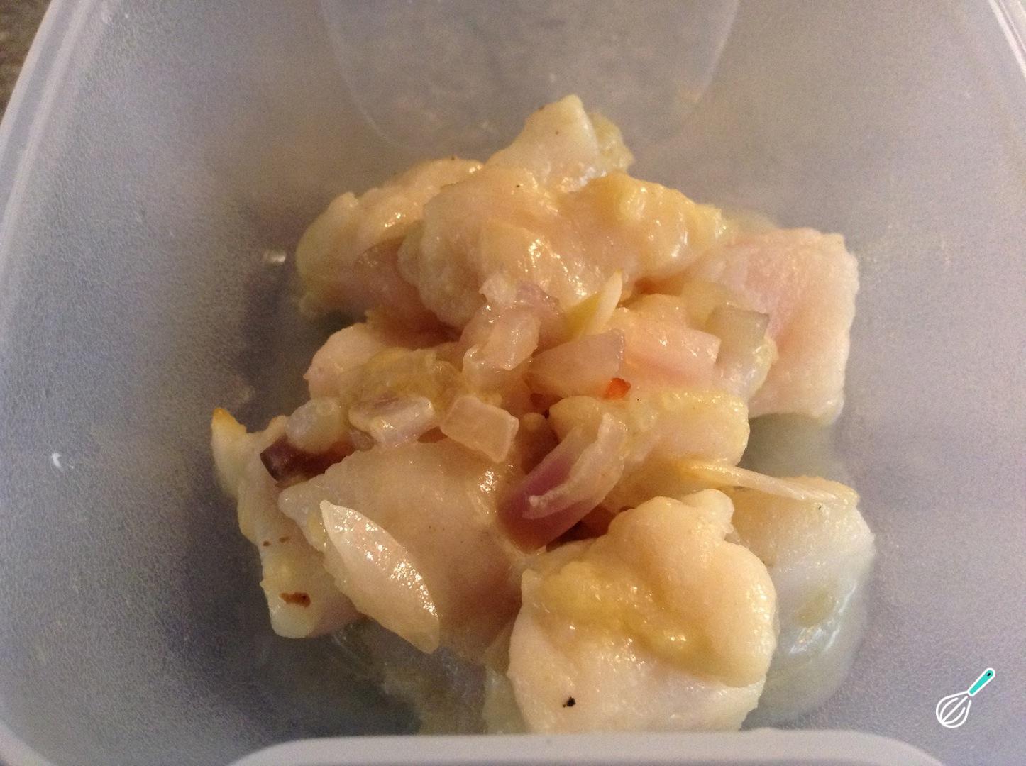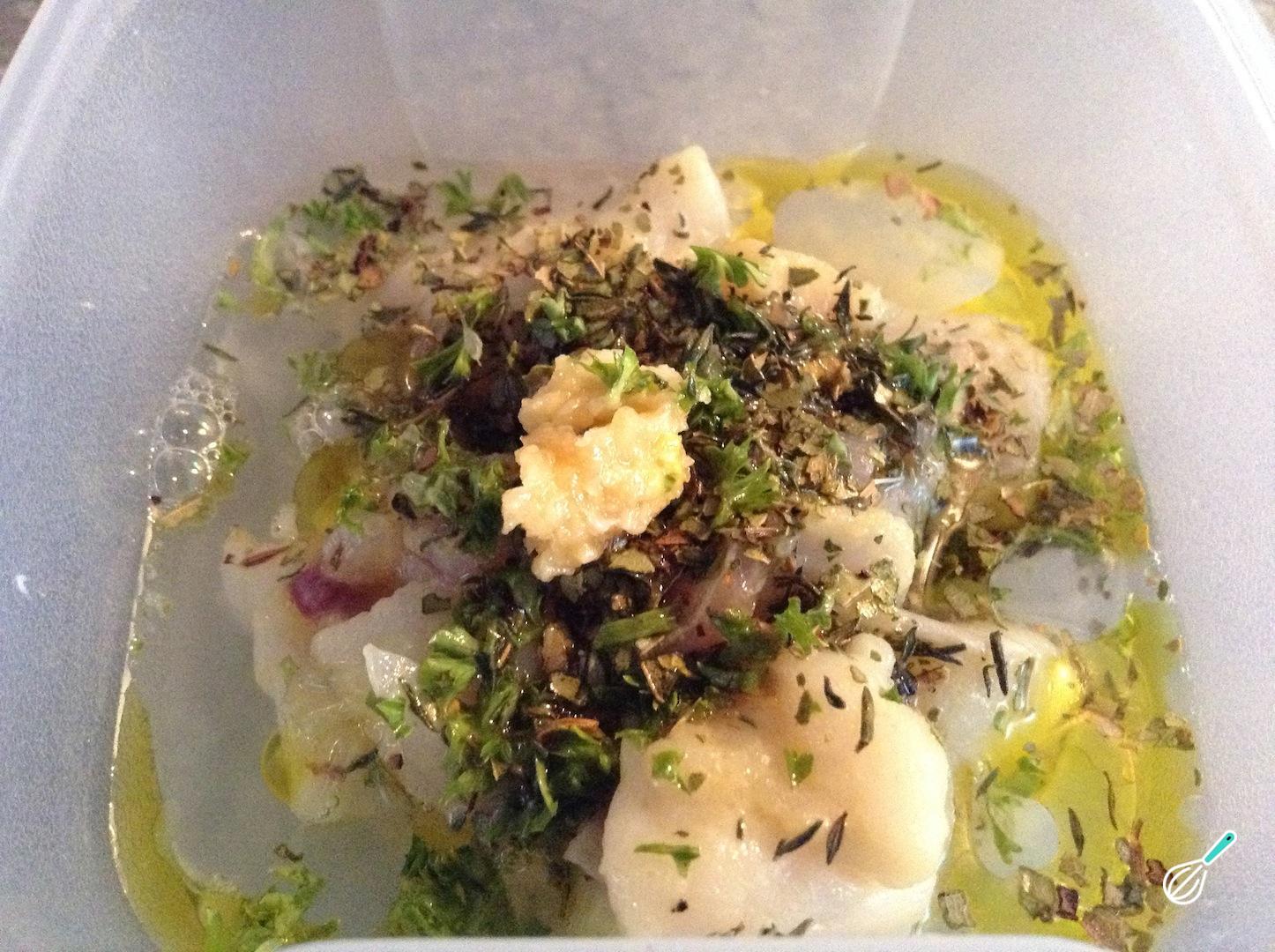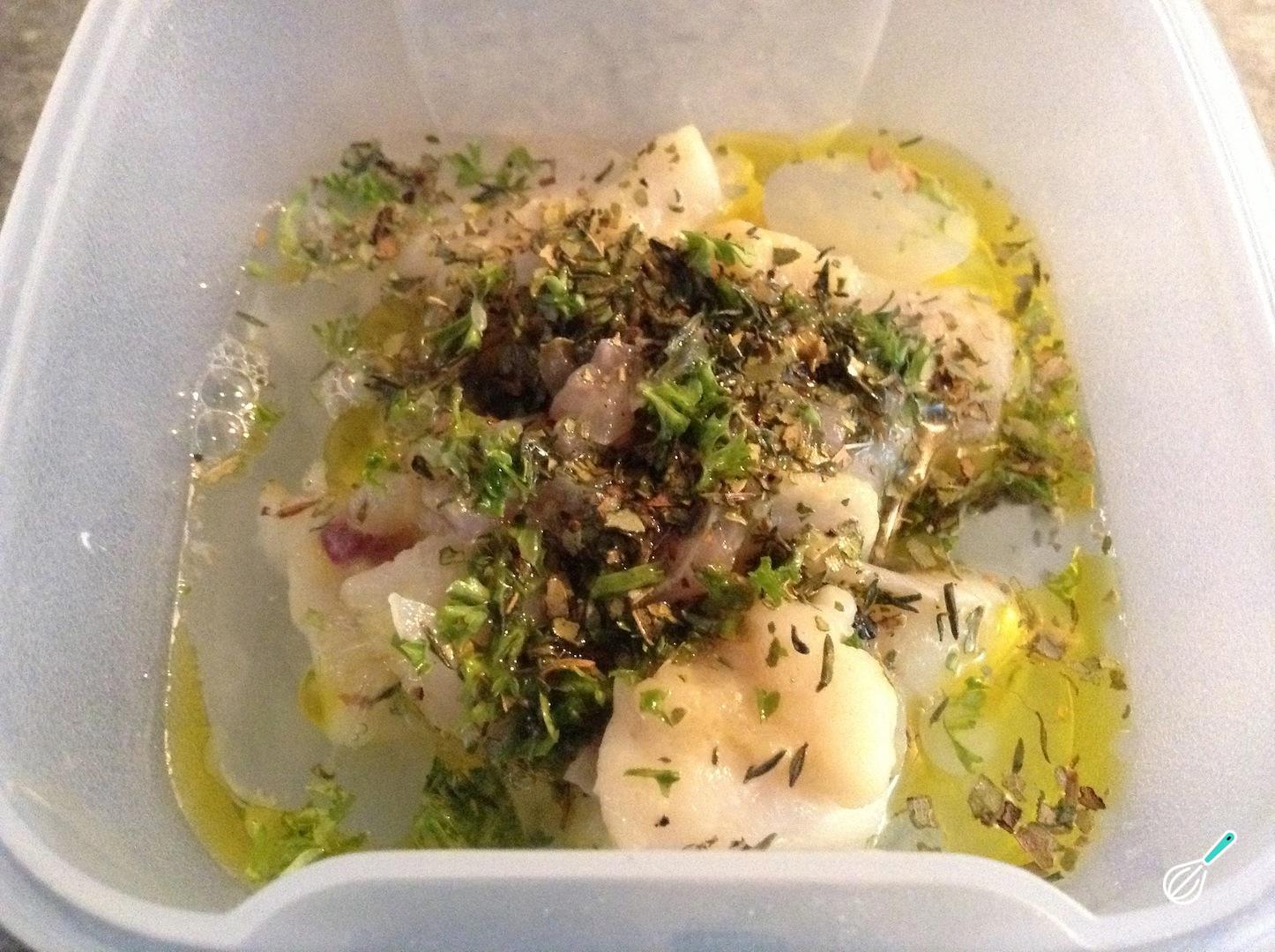 O primeiro passo para fazer a receita de bacalhau marinado em azeite é preparar todos os ingredientes.