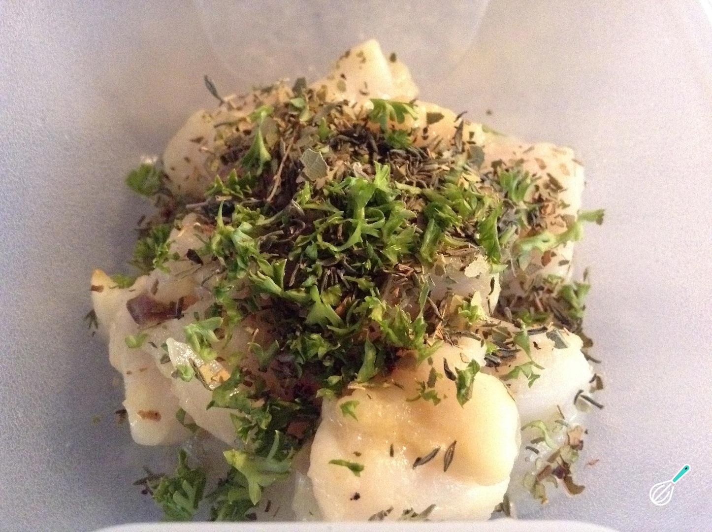 Adicione a pasta de alho e misture muito bem todos os ingredientes. Deixe o bacalhau marinar na salmoura para absorver bem os aromas dos ingredientes.