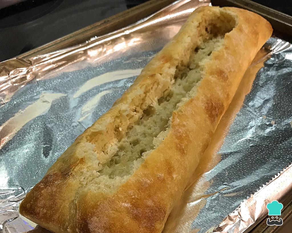 Comece cavando um buraco na baguete, fazendo um tipo de um barquinho, como na foto, para colocar o recheio sem chance de vazar. Reserve.