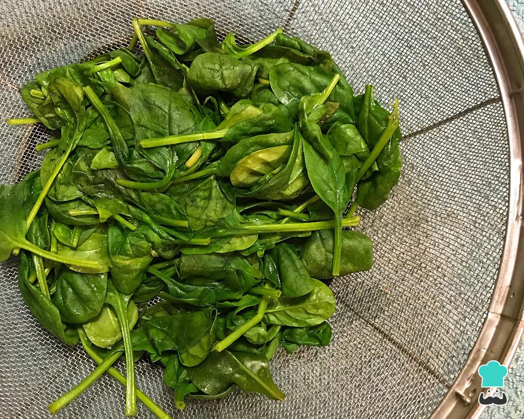 Coloque o espinafre numa peneira (que não seja de plástico), ferva mais ou menos 1 litro de água e jogue sobre as folhas. Elas vão murchar levemente, como na foto, esse é um jeito bem rápido de dar uma fervura no espinafre. Aperte bem, para retirar o excesso de líquido, e reserve.