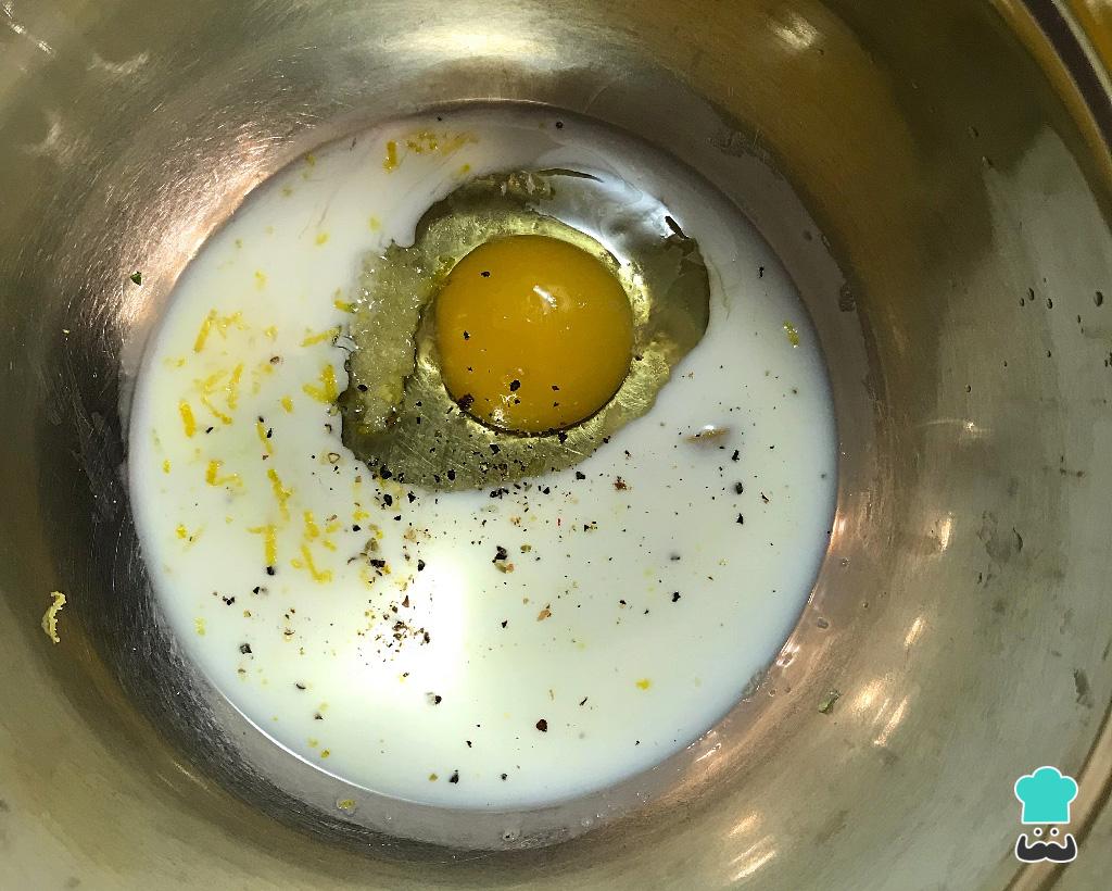 Num bowl coloque o leite, o ovo e os temperos: as rapas do limão, o alho ralado, a mostarda Dijon, o sal e a pimenta. Mexa bem.