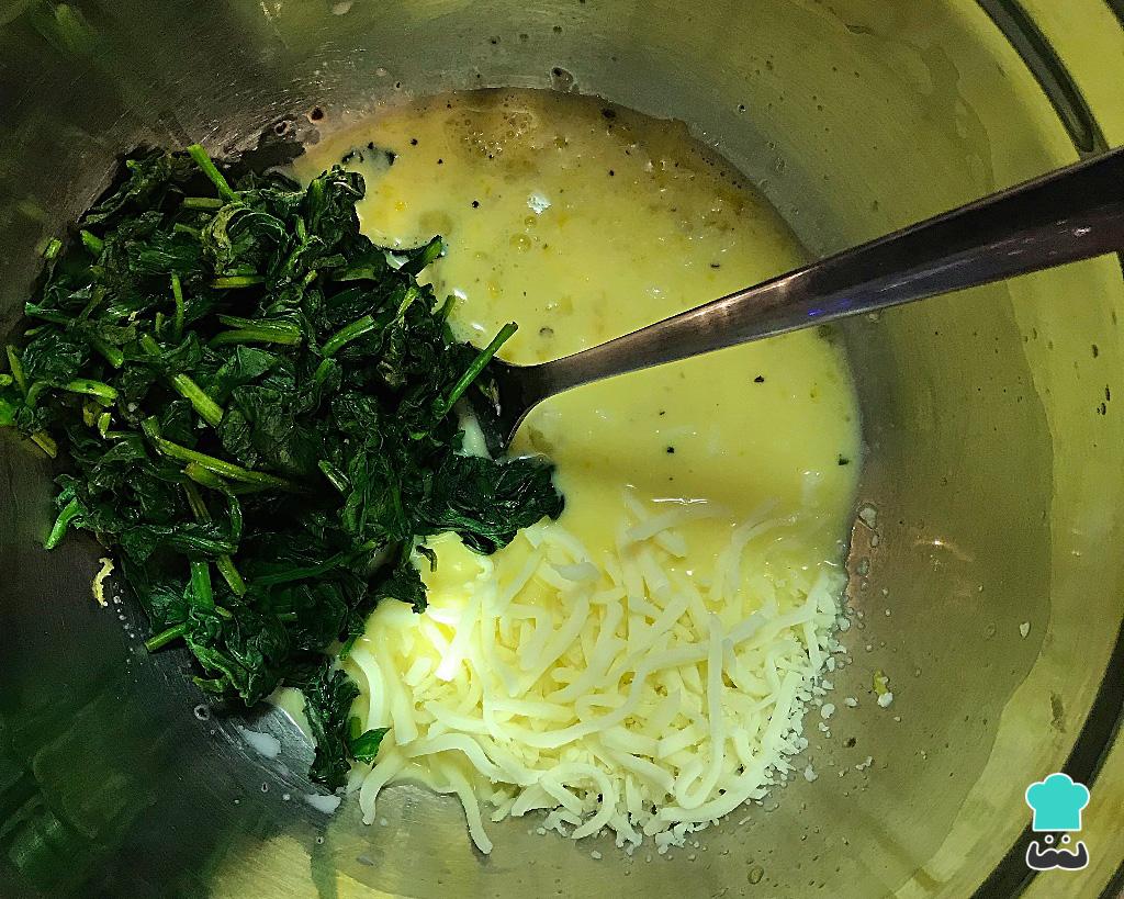 Na mistura de ovo com leite adicione 50 gramas da mussarela ralada e o espinafre já frio. Mexa bem.