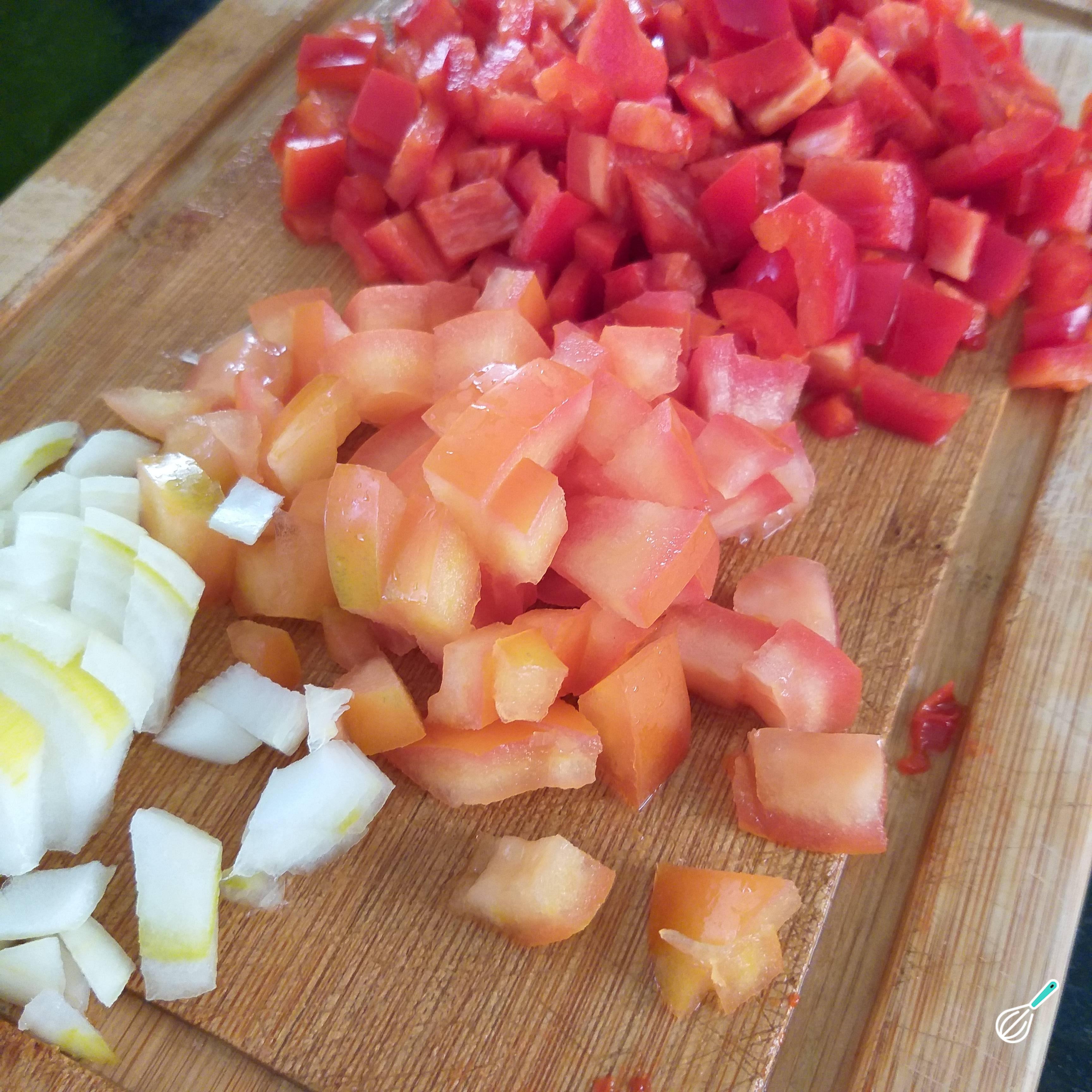 Para preparar esse baião de dois com sobras de arroz e feijão corte a cebola, o tomate e o pimentão em cubos pequenos. Leve-os ao fogo médio numa panela com um fio de azeite e misture bem.