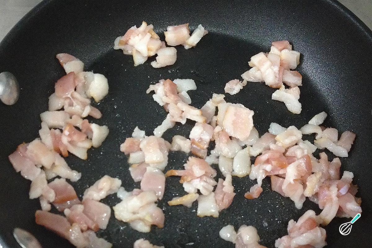 Em uma panela grande, leve ao fogo médio e adicione o bacon picado. Deixe fritar até que solte bem a gordura e fique levemente crocante, pois é essa gordura que vai ajudar a dar sabor ao preparo do baião de dois com feijão de corda. Assim que o bacon estiver no ponto, retire-o com uma escumadeira, coloque em um prato forrado com papel-toalha e reserve para usar mais à frente.