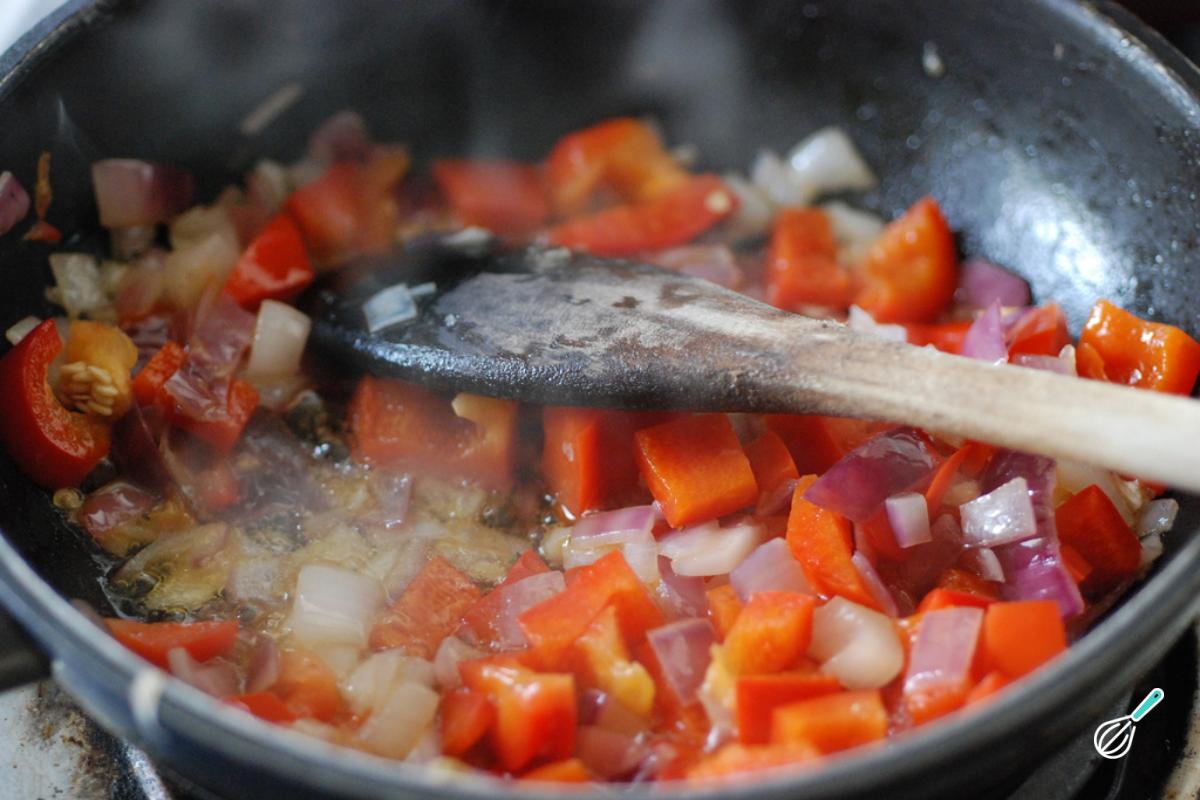Na mesma panela em que você fritou o bacon, mantenha a gordura e acrescente uma colher de manteiga para dar ainda mais sabor. Em seguida, adicione o pimentão picado e a cebola. Refogue bem, mexendo sempre, até que fiquem macios e comecem a dourar levemente, liberando seus aromas. Nesse momento, entre com o alho picado, deixando refogar por mais alguns segundos para não queimar.